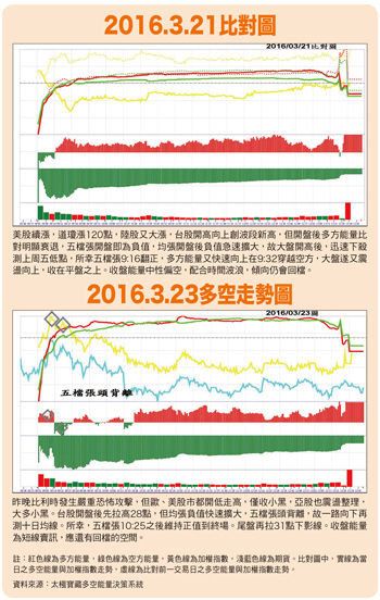 上周二(三月十五日)台股收盤大跌一三六點,但我在當日媒體及上周本欄中,都強調八七七七點不是高點,下殺正可積極選股作多。果然,台股就殺那麼一天,多方立刻強勢反擊,連漲三天!不僅突破八七七七高點,上周五還收盤站上八八○○點大關!然而,從時間波浪來看,本周為七六二七低點上漲第八周的時間轉折。因此,我在上周五到本周一的媒體解盤中,都預告本周為空方發球區,周一見高,易開始回檔。本周一(三月二十一日)由於上周五美股續漲,道瓊漲一二○點,陸股又大漲,台股開高向上創波段新高!但開盤後多方能量比對明顯衰退,五檔張開盤即為負值,均張開盤後負值急速擴大,故大盤開高後,迅速下殺測上周五低點。所幸五檔張九點十六分翻正,多方能量又快速向上在九點三十二分穿越空方,大盤遂又震盪向上,收在平盤之上。收盤能量中性偏空,配合時間波浪,八八四○點有可能是短線高點,開始震盪回檔。三月二十二日台股開一低破低盤,果然開始回檔,盤中一度大跌九十九點,測十日均線,所幸五檔張積極偏多,多方能量尾盤明顯向上,故大盤從十二點二十分之後拉尾盤,留七十二點長下影線,收盤僅小跌二十七點。