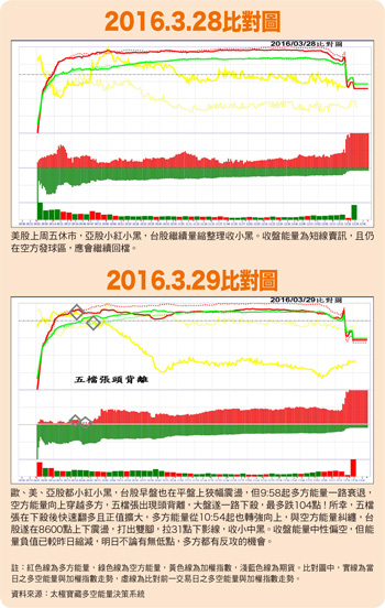 從三月十八日開始我就不斷預告:台股將面臨七六二七點上漲第八周的時間轉折,從三月二十一日起,將進入七至八天的空方發球區,加權指數有下探八五八九~八六三七點的機會。果然台股在三月二十一日見到八八四○高點之後,就連續下跌六天。三月二十九日已是空方發球的第七天,當天收盤八六一七點則剛好位於支撐區中,時間、空間都完全符合之前的預測。其實三月二十九日歐、美、亞股大多小紅小黑,美股電子盤小漲,韓國股市還拉高。台股早盤也在平盤上狹幅震盪,但九點五十八分起多方能量一路衰退,空方能量向上穿越多方,五檔張出現頭背離,大盤遂一路下殺,最多跌一○四點!上櫃指數更大跌二%上下!許多人又開始看空台股,擔心波段轉空大跌。然而,每一次回檔洗盤的末端,不都是如此嗎?以能量而言,三月二十九日並無波段賣訊,且收盤能量負值已較前一天縮減,五檔張正值也明顯擴大,三月三十日不論有無低點,多方都有反攻的機會。因此,我仍照原本的預測,認為空方發球區應在三月二十九日到三月三十日結束。只是能否直接轉為多方發球區?由於即將面臨四天的清明長假,加上市場對清明變盤的疑慮,也不排除短線先作反彈之後還會震盪回測。然而,上漲第八周收黑、清明長假前整理,都不是壞事。從周線來看,七六二七點上來應會走五小波,而八八四○點至今為第四小波的回檔,還有第五小波可期。理論上應會突破八八四○點,朝九千點大關前進!至於能否像市場所說,往大C波測量滿足點九二九五點前進?就比較難說,在行進過程中我們會持續追蹤研判。至少目前尚無波段賣訊,八六○○點以下應可選股作多。