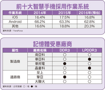 DRAM產業成長要靠安卓陣營智慧型手機規格不斷升級,雖減少LPDDR的使用數量,但卻增加LPDDR的容量要求,記憶體通路業者表示,Android作業系統能否有效抵禦iOS大軍,在智慧型手機領域攻城掠地,攸關DRAM產業未來在高容量LPDDR商機會膨脹還是縮水。業者解釋,以三星智慧機為首的Android陣營對LPDDR3容量需求,最高已增加至4GB;而以蘋果為首的iOS陣線則長期停留在1GB,目前外傳iPhone 7採用的LPDDR3頂多也到2GB而已。TrendForce數據顯示,二○一六年全球前十大智慧機銷售中,作業系統採iOS佔一六.八%,而Android佔六二.八%,與兩作業系統陣營在智慧型手機市場佔比,大致維持與二○一四的佔比相同。法人預估,未來智慧機採用作業系統Android的市佔,仍遠高於採用iOS系統,故DRAM市場在智慧機領域上,將如通路商所言,持續往高容量LPDDR3邁進,甚至改採更高效率的高容量LPDDR4也將逐漸成趨勢。而在伺服器用DRAM市場,也將隨Intel帶頭將伺服器改採DDR4記憶體,而帶動高階記憶體商機,此外,市場亦傳出去年中國大陸散熱機板業,因應客戶新舊伺服器機種交替,訂單將遞延至今年底發酵。法人表示,目前台灣記憶體廠較能在二○一六下半年,同時受惠伺服器記憶體DDR3/4,智慧機記憶體LPDDR3的通路商機,將落在DRAM通路商至上、大聯大,而DDR3訂單則由DRAM製造商南亞科享有。