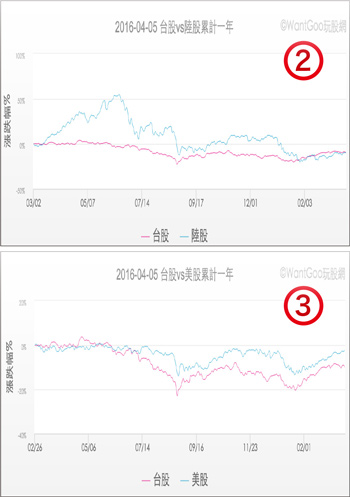 位階處低檔 操作可稍大膽現階段陸股是處於相對低檔,所以你其實可以稍微放大資金比例操作,但是會不會重現去年的瘋狂牛市,我覺得不會,因為中國政府已經知道去年這種行情對整個經濟不一定有好處,而且等到開始修正時又會出現很多社會問題,所以繼續走慢牛才是政府的計劃經濟想要看到的,講實際一點就是不用怕買不到,不用追高,想要跟進多單,等回測進場就好,會有機會讓你上車的。最後提醒你一下,如果你是做台股的,你可以不用觀察或操作陸股,因為雖然媒體一直告訴你陸股會影響台股,但是其實兩者之間的關聯性很低,你可以看(圖2)。這張圖是一年內台股跟陸股的走勢比較圖,有沒有發現其實兩者之間沒什麼關係,陸股走多頭大漲,台股不一定大漲,陸股崩盤,台股不一定大跌。美股跟台股之間的關聯性更大(圖3)。