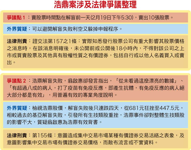中研院院長翁啟惠因涉及台灣浩鼎生技公司內線交易乙案,現在已經進入司法程序,主管機關無法對外公開相關內容,因此立法院財政委員會於四月十三日召開秘密會議,針對所涉證交法及稅務相關問題調查情況,金管會向國會「解盲」,《理財周刊》針對其中疑點作剖析。時間點 真的那麼巧?!翁啟惠日前以書面報告書坦承,名下並無浩鼎股票,但確實有協助女兒翁郁琇理財並認購浩鼎三千張股票,在免稅額度內贈與股票及現金。另外,發言表示絕大多數有免疫反應的受試者都有療效,只是從希望能夠讓這個產品「有條件通過」的「普遍有效」角度來發言,絕無任何企圖影響股價。浩鼎董事長張念慈三月三十日也表示,翁啟惠在二月十八日代女兒翁郁琇變賣股票,當時並不知道解盲結果。就連隔天二月十九日傍晚解盲結果一出來,當下第一時間,浩鼎高層包括董事長在內,只有五人知道,連翁啟惠「當時也還並不知情」。解盲前賣股 是否因提前知道?外界質疑解盲結果是否能提前知道,張念慈曾經解釋,日本公司須將投藥試驗的亂碼數據,提供給負責統計分析的台灣公司進行解碼後,「才能完成解盲」,也就是說,隔天浩鼎收到台灣統計公司解碼完成後傳過來的結果,才能把保險箱打開。召開秘密會議 避免過度揣測財委會民進黨召集委員立委徐國勇表示,此次爭議發燒不斷,時常因媒體報導、立委質詢影響股市行情波動。因此他建議,為避免外界過度揣測,不如召開秘密會議,讓金管會來報告。徐國勇也認為,全案必須依照法律程序指導原則,維護程序正義。基於調查結果前「無罪推定」原則,以及諸多疑點「事實不明」角度,是不應該先「扣帽子」的。至於翁啟惠個人是否違反院內技術移轉利益迴避原則,還是需要他個人再重點釐清。另外,士林地檢署最近也緊鑼密鼓展開調查,對象包含浩鼎實驗團隊、中研院官員等相關證人,同時也約談幫忙翁啟惠處理股票的玉山證券阮姓營業員,以了解賣股的過程。政府應建立良好的投資環境 浩鼎事件後,我們也認知到幾件事情:台灣投資散戶多,缺乏風險評估的能力,只要一有相關有力人士背書或加強說明,又會狂炒作股價。然而,姑且不論內線交易爭議,對於要發展生技產業的台灣來說,短線操作實在不利產業發展;另一方面,對於散戶而言,投資失敗會血本無歸,但專家或公司卻毫髮無傷,可以東山再起。再者,主管單位應該要因此警惕,善盡宣導職責,告知新興產業高風險特質,避免股民可能因此傾家蕩產。
