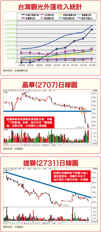 中國技術性管控入台證 觀光業打冷顫由於準總統蔡英文遲未對「九二共識」相關文詞內涵、代表意義作出清楚的解讀,不僅引發中國對於未來能否沿襲藍營主政時的兩岸往來良好默契的質疑,也同時挑動兩岸能否正常交流的敏感神經。自開放陸客來台觀光後,隨著來台陸客人數大幅成長,台灣的觀光外匯收入也跟著水漲船高。據官方統計資料指出,截至去年底,年度來台陸客人數已高達四一八萬人以上,而台灣整體觀光外匯收入前年底已成長達四四三八億新台幣。陸客來台帶來的觀光業產值增長、外匯存底挹注力道之強,可見一斑。據官方統計資料,二○一五年陸客來台總人數約四一八萬人次,其中,自由行一三三萬人次,團客、自由行人次雙雙較二○一四年度增加。據交通部觀光局預估,如以去年每位陸客每天平均二五○美元的旅遊支出推估,去年陸客即為台灣創造約二二四七億元外匯收入,不但續創歷史新高紀錄,亦為來台各國旅客之冠,成為台灣觀光產業連年成長主力推手。近期媒體報導,中國官方於一月中旬,在新任中華民國總統正式選出後,由於政治主張及統獨立場明顯歧異,即刻啟動相關「應對機制」,早早即擺好「聽其言、觀其行」的觀察態勢。不久,隨即傳出中國政府正式「出手」,限縮陸客來台觀光人數,意圖間接藉由「島內聲音」的反制力量,「導正」台灣領導階層走回其設定好的「正確」方向。因此,市場傳出旅遊風景區、飯店及旅館、遊樂區原本絡繹不絕的熱況已見大幅降溫。觀光業衝擊效應 賣車、賣飯店風聲不斷自大選結果出爐,截至目前,統計陸客團來台人數共已減少約四.六五萬人,觀光業者少賺的外匯收入高達約二十六億新台幣。如果依官方統計資料估算,三月至六月期間來台陸客將可能減少達三十五萬人以上。以陸客來台觀光所展現的消費力估算,亦即等同將會有二一五億新台幣像煮熟的鴨子般飛了。其實,目前已經可以明顯看到陸客來台旅遊人數限縮造成的衝擊,旅遊界已傳出有遊覽車、小巴士業者付不出車貸,準備要找買家接手。據高雄飯店業者表示,近來聽聞有意賣出旅店業者,至少高達八家,大多數均以承接陸客團旅遊住宿為主。事實上,全台已陸續傳出超過五十間旅館、飯店正進行求售中。綠營色彩濃厚的高雄市,營業規模排名前三大的連鎖商旅業者,也傳出將調整營運戰略方向,旗下旅店亦計畫出售,引起市場人士一陣驚愕。隨著台灣觀光業景氣開始降溫,更有旅行社業者進一步指出,目前已經有多達二十個陸客旅遊團,因官方簽證核發進度緩慢的「技術性」阻攔,被擋在中國出境海關前,取消來台行程。台灣旅遊業者原本期盼可以吃到的市場大餅也再一次落空,連帶影響到相關個股近期股價表現。歐美中市場乏善可陳 自行車雙雄失色歐、美、日等已開發國家市場,現階段合計占台灣自行車出口總量七八%以上,包含自行車整車和零件出口,為台灣自行車業者最大的出口消費市場。但去年出口總量、出口值均見到下滑窘境。其中,經濟仍未見明顯復甦,出口量占比五○%的歐洲市場衰退表現,為台灣自行車製造業者營運規模衰減最主要原因。另外,雖然出口量占比二○%的美國市場經濟已自去年第二季起開始回溫,自行車市場需求量也見明顯反彈,唯近期庫存水位已再度拉高,未來恐將持續壓抑台灣自行車業出貨成長力道。中國目前已經成為全球自行車市場需求量、產量規模最大的國家,約占全球總出貨量六七%及三○%需求量。由於台灣自行車業者已在中國高階自行車市場占得領先地位,而中國未來人民可支配所得仍可持續增加,加上以休閒用途為主的自行車車主也與日俱增,預料中國高階自行車市場未來將可為台廠帶來持續成長機會。