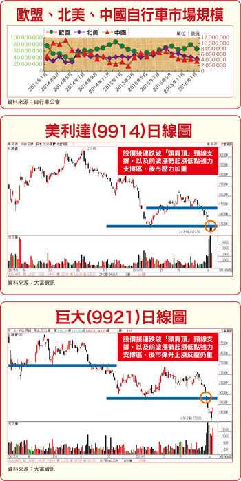 然而,中國自行車市場未來的競爭壓力將會不斷加重,最主要將來自當地業者加入搶市戰局。中國自行車製造商具備強大產品模仿力,加以自行車整車製造競爭門檻不高,因此中國本土自行車業者產品品質很有可能會在短期內趕上台廠,更有可能因產能擴充,能維持產品低廉售價,預料將造成台廠業者相當大的毛利率維持壓力。 至於後市發展,由於目前占台灣整體自行車出口總值達七五%以上的已開發市場,需求已見停滯,去年出乎意料僅有微幅成長,加上中國高階運動自行車市場今年全年銷售量預估可能會大幅下跌三○%,對目前於中國自行車市場主攻高階運動車款的台灣自行車雙雄巨大(9921)、美利達(9914)而言,無法彌補已開發國家自行車市場今年需求可能持續疲弱,以及對中國整體出貨量持續下滑所造成的缺口。展望今年,在全球自行車市大環境不佳下,終端消費市場庫存仍需要較長時間去化;加上匯率升貶變數仍然存在,且中國經濟成長動能也仍面臨持續放緩挑戰。巨大、美利達同時指出,今年對台灣自行車業者來說,將會是營運難度拉高,極具挑戰性的一年。