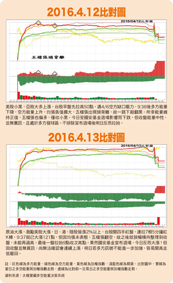 上周三(四月六日)本欄截稿日,台股重挫一四四點,跌破八五八五點頸線,市場上悲觀氣氛瀰漫,都說台股帶量破線、頭肩頂成形,要先下探季線八三○○點附近,甚至因為四月十二日國安基金很可能宣布退場,不少人看台股波段就此走空。但我在媒體與本欄中都清楚說明,這波回檔是來回補之前所說一定要回補的三月二日多方缺口,配合四月八日為八八四○點拉回第十三天的時間轉折,四月七日將三月二日缺口全部回補之後,若能量沒有賣訊,四月七日至八日就是技術面的買點。至於國安基金退場的問題,因為四月十二日這個時間全市場都知道,反而不會就此走空,頂多是四月八日時間轉折反彈後,四月十二日再作壓回,但十二日下午果真宣布國安基金退場後,反而次日很可能利空出盡、向上拉抬。四月六日之後的走勢相信各位都很清楚,完全符合我們的預測!四月七日完全回補三月二日缺口後,當天留五十三點下影線,收盤能量不但沒有賣訊,能量正值還擴大,均張負值較四月六日大幅縮減。而四月八日在美股開低走低大跌一%以上的利空下,台股開低先下探四月七日低點力守,隨即一路拉抬,收小中紅。本周一(四月十一日)續漲二十一點,四月十二日早盤先拉高五十點,遇四月六日空方缺口壓力,且受預期國安基金退場影響而一路下殺收黑!但收盤能量中性,並無賣訊,且處於多方發球區,四月十三日果然開高走高大漲一二○點作收!