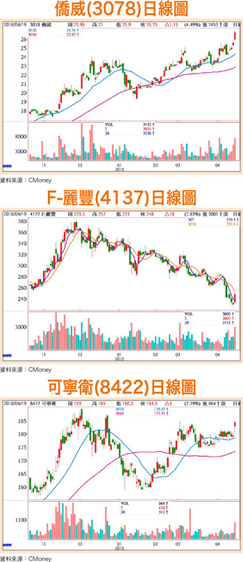 僑威、F-麗豐、可寧衛 營運前景透明度高僑威(3078):電源供應器產銷大廠,去年合併營收五八.三三億元,毛利率二一.七%;稅後盈餘五.九五億元,創歷年新高,EPS二.六二元。配發現金股利一.九元,以四月十九日收盤價二六.七五元估算,殖息率高達七.一○%。僑威三月合併營收四.八一億元,年增八.五三%;累計一至三月合併營收一三.二二億元,年增一五.二八%。近兩年中國積極布建4G基礎建設,各大城市已陸續採購安全監控設備,僑威受惠安控市場商機大幅成長,目前已成為中國最主要安全監控廠「海康」供應鏈,亦開始透過中國客戶觸角延伸接單,陸續交貨予江蘇、浙江省客戶。現階段最夯的電動機車、電動腳踏車,也已開始出貨給中國客戶,出貨量持續穩定成長。僑威指出,預估隨著各產品線出貨持續量增,加計越南廠營收貢獻,今年營收表現優於去年機會很高。F-麗豐(4137):美容產品及護理套組產銷專業廠,去年營收、獲利同步成長四○%,EPS一四.六八元。三月營收四.三二億元,月增七七.七三%;累計第一季營收一一.二八億元,年增三三.八一%。產品行銷採「多元銷售平台」模式的F-麗豐,主要核心通路為克麗緹娜實體店面,截至去年底,中國地區加盟總店數多達三四四三家,台灣為二二七家;麗豐加盟店方面,展店總數高達三六七○家。另外,品牌授權通路業務發展,中國克緹今年全年業績有望維持四○%高成長率,為F-麗豐帶來營收貢獻,今年營收占比預料可維持三○~三五%。其中,授權收入有望交出四○%年增率,代工業務營收年成長率最多可達一五%。F-麗豐去年進行大規模通路營運績效考評,有效提升單點銷售力,由於新增店數約五百多家,關收店數亦達五百家以上,全年淨增加店數不到一百家,今年通路營收有機會挑戰二位數成長率。電商平台「新美力」目前已搭建微信商城、PC商城,也將推出APP擴大市場接觸面。線上護膚產品均為克麗緹娜品牌,但線上、線下推廣業務會做明顯區隔,未來也將進一步推出嬰幼兒、健康相關產品。受惠核心通路、新美力電商平台營收貢獻下,今年本業年成長幅度有機會達一成。品牌授權通路方面,有望於中國克緹持續高成長動能推升下,年增幅上看三○%。法人預估,F-麗豐今年營收成長可望挑戰二成水準,EPS有機會達十八元以上。可寧衛(8422):台灣最大事業廢棄物處理廠,去年營收達二七.五億元,年增二九.二二%;毛利率六一.六六%,營益率高達五一.五五%;全年合併稅後盈餘達大增達一二.三二億元,年增二○.○三%,EPS一一.三二元。三月營收三.三五億元,月增二二.二六%,年增三七.二七%;累計一至三月營收八.一二億元,年增率高達四七.五一%。預定配發十元現金配息。法人推估,去年可寧衛來自專案訂單營收貢獻高達八至九億元,幾乎比前一年倍數成長。製程客戶訂單方面,因公司持續施行接高毛利率訂單政策,推升營收年成長達一五%。法人估可寧衛今年還會有八億元以上專案訂單將於上半年完工入帳。製程客戶訂單預估有機會隨環保意識抬頭、環保法規規範日趨嚴格,加上大型企業日益重視環保處理之社會責任,後市有望接獲大企業廢棄物處理訂單。同時,考量下半年原有大型專案將陸續結束,今年仍將積極把握承接專案訂單,維持原有營運成長動能。法人推估可寧衛今年營收有機會成長一○%,全年EPS有望持續成長達一一.五元,進一步挑戰十二元。