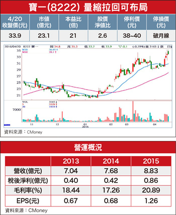 寶一(8222)為航太發動機零組件供應商(一○○%),主要產品聚焦在引擎高溫燃燒段、渦輪段,零件替換率高,且特殊製程多,不易被取代。航太產業的特質就是技術層次高、認證時間長、進入門檻高,且上下游關係密切,因此廠商不會輕易更換供應商。由於航太飛機引擎市場為寡占市場,如果通過認證成為合格供應商後,可擁有長期且價格穩定的銷售市場。台灣目前只有漢翔(2634)、長榮航宇及寶一等少數廠商,可獨自承接國外發動機零組件訂單,其餘多數航太廠商都是靠漢翔、日商轉單及美商工業合作長單,由此可知,寶一的技術優勢相當具有競爭力。目前正處於航空業十年大換機潮的效益開始發酵,寶一將受惠航空公司進入更換節能環保的下世代飛機,以及飛機製造商因為成本考量而對亞洲供應鏈釋出更多訂單。目前寶一是國際引擎龍頭廠法商Snecma(斯奈克瑪)、美國引擎大廠P&W、比利時Techspace Aero、義大利GE Avio S.r.l、德國MTU、日本三菱重工以及法國Hispano-Suiza等發動機製造大廠的Tier 1供應商,進入門檻相當高。今年接獲LEAP兩品牌客戶訂單,為了因應新世代發動機的長線成長需求,寶一今年將尋覓三千坪土地以作為擴廠之用,新廠約需半年至一年時間可望建成,未來成長動能不虞匱乏。寶一三月營收一.○二億元,年成長五八.九%,月成長二七.七四%。操作建議:四月十五日一根帶量長紅K棒,確認短期拉回修正結束,股價將沿著月線向上走高,只要量價結構配合(價漲量增、價跌量縮),波段漲勢就將持續進行。