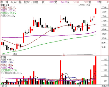 國際股市驚驚漲,道瓊指數已來到一萬八千點大關,相當於台股九五○○點,但不代表台股應該漲到這樣的位置,因為與台股更為相關的費半指數約為台股九千點,說明兩件事,一是國際股市熱錢仍滾滾來,二是漲的為非電子,而台股因為電子股比重過高,近期相對美股疲弱,但也代表目前仍是多方控盤,只是上攻之路崎嶇。電子股會疲弱不是沒有原因,從四月初以來我所布局的都是非電子股,其中又以生技為主。電子股根本問題在匯損,第一季台幣兌美元從最低三三.八三漲到最高三二.二八,匯損問題將在五月十五日前公布的季報揭露。再加上日本地震影響蘋果手機出貨,兩大利空罩頂,這也是為何自四月初以來我只買非電子股。連續介紹兩期的生技股,或許很多投資朋友因為浩鼎問題而不敢介入,不過看看邦特(4107)半個月從一四○漲到一七○元,旭富(4119)從七十八漲到八十八元,太醫(4126)從八十二漲到九十七元,以上為醫材股,另外重點布局的葡萄王(1707)也自一八三漲到二一○元。但以浩鼎為首的新藥股中裕、智擎等卻沒什麼表現。其中最大差異,在於是否已看到獲利的成果,醫材、保健股都已逐漸看到獲利的成果,如邦特三月營收創單月新高,旭富三月營收年增一四一%創歷史新高,葡萄王因子公司葡眾去年業績大躍進而表現亮眼,新藥股卻看不到任何成果,當然沒人敢投資。 既然介紹的生技股已如預告普遍出現大漲態勢,自然是打鐵趁熱,再續追蹤,正所謂漲時重勢,五二○前生技不寂寞。