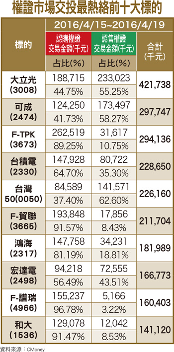 本周排行榜有個有趣的變化,除了蘋果供應鏈的老朋友外,汽車供應鏈及零組件逐漸成為吸睛焦點。最近引爆話題的莫過於特斯拉出品的Model 3,售價僅約三萬五千美元(約新台幣一一三.七五萬元),加上政府補助,實際售價可望降到台幣一百萬元以內,在三月底發表並接受預購後,訂購量就達到逾二十七萬輛,光以接單量來看,幾乎是特斯拉自二○一三年以來累積銷量一五七%。Model 3預計明年底才會開始量產交車,並宣布二○一八年全球電動車銷售要衝上十五至二十萬輛,二○二○年達到五十萬輛目標。F-貿聯(3665)被認為是最純的特斯拉概念股,主要是其為特斯拉電動車連接線組獨家供應商,也供應特斯拉超級充電站的控制箱線束,Model 3訂單大增,F-貿聯營運可望同步進補。和大(1536)已是特斯拉減速齒輪箱獨家供應商,特斯拉超級充電站可望明年新車款推出後出現大幅成長,和大新廠已在進行裝機,初期兩條產線預計六月投產。本周三期指結算後,下一次結算是五二○新總統就職之前,可多留意籌碼面變化,產業發展趨勢,或是不同技術指標間的增減強弱,並利用權證低金額高槓桿的特性,在可承受的風險下擴大獲利。