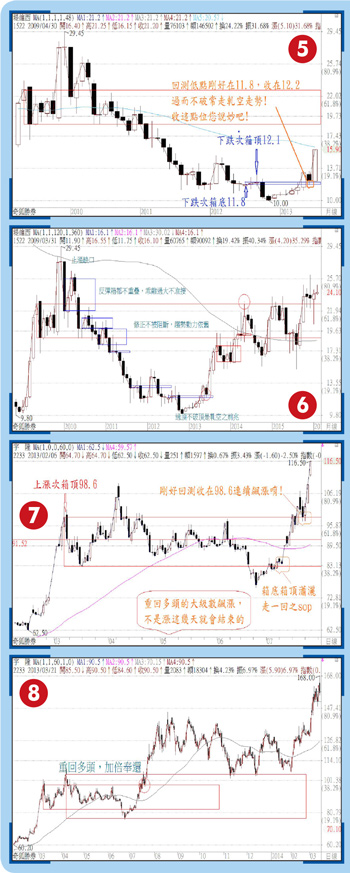 有人喜歡順勢操作,有人喜歡逆勢操作。到底如何是順勢?如何是逆勢?就像台灣在大陸的東邊,雲林縣在台灣的西邊,古坑又在雲林縣的東邊。請問古坑在東邊還是西邊?要去古坑要向東還是向西?其實古坑還是古坑,在東在西是對大空間與小空間的不同相對位置而言。在操作上,以長中短三個級數來講,長線一定要順勢,中線以逆勢最好,但是在短線上又必須要順勢才行。換句話說,當長線轉多當然要順勢做多,應等中線回檔修正時才買進是中線逆勢,要等中線一段回檔內的短線波動阻斷時切入,豈不是短線順勢?因此箱波均操作理論就有兩級操作法與三級操作法之操盤差異與觀盤技巧。箱波均之級數劃分及運用:1.先將不同級數K線圖賦予適當級數的均線劃分。2.之後只要選擇自己喜歡的操作週期,就可以守一K線圖,而判別行情在某個長線範圍內之長短線趨勢的脈動。3.繼而找出長線的末端及相反趨勢方向短線的開始,達到用長線保護短線、用短線發掘先機的目標。以上是級數的概念,比如說月線圖是過而不破的回測,此時長線是買點,中線是下跌波動,短線要出現止跌。以之前發表過的可成(2474)圖示為例(圖一、圖二),過而不破下跌次箱頂是軋空前兆,在月線圖出現兩次回測下跌次箱底。第二次走完次級修正波動,也就是修正一年多之後的止跌上漲力道會很強,長線要拉回買,中線修正abc之後出現c波的止跌訊號,也同時出現過而不破c波的下跌次箱,此時就是確定短線的切入與加碼之時了,後面漲到現在約有一倍以上的幅度! 再以F-TPK(3673)為例(圖三、圖四):跌破次級波動上漲次箱底反彈轉浪不成為缺口,此時為六十日的止漲缺口,也就是後面修正的時間與空間非常大!後面從六四二元跌到一五二元,這就是如何在長線是空頭趨勢於中線上漲反彈的末端,找短線止漲的空點的方法!以上簡單的箱波均三級概念,所謂順勢、逆勢是相對性的,而短、中、長依照箱波均這樣的邏輯搭配,您說是否合理好用? 買在發動點是投資者最希望的,而運用箱波均的「過而不破」作切入經常會有意想不到的結果,而且主力該守的關鍵點就在箱波均裡!堤維西(1522)也是如此(圖五),下跌阻斷之後回測十二.一元有守,月線長紅往上表態,這就是箱波均「過而不破」的威力!現在來到上漲次箱附近,需留意能否重回多頭走勢,若無法收復並站穩上漲次箱頂,則需小心波段單,要適時獲利減碼!再看圖六,我們發現左邊的上漲次箱頂為二二.七五元,此標的物最高點來到二二.八元,就來到曾經跌到之處止住!只差○.○五元,箱波均的關鍵數字真是巧如天工!一切盡在不言中,經過觀察與實例驗證,相信於關鍵次箱處,都是轉強噴出發動的切入點!重回多頭的大級數飆漲,今天回顧之後又再度印證。宇隆(2233)最高點來到一六八,上漲時間約八個多月(圖七、圖八),懂得箱波均的級數定義與研判,波段操作真的是以逸待勞!以上為之前發表,後面印證箱波均控盤戰法之可靠性與實用性,當然還有非常多範例,有機會再分享給讀者。