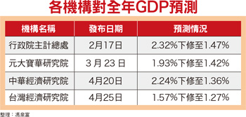 台經院二度下修經濟成長率至一.二七%由於全球經濟景氣復甦緩慢需求疲軟、五二○後兩岸經貿前景未明、外貿表現衰退,各研究機構紛紛下修了台灣經濟成長預測。行政院主計總處於農曆年後把GDP成長率由二.三二%調降至一.四七%,元大寶華研究院也從一.九三%下修為一.四二%,中華經濟研究院則由二.二四%下修至一.三六%。台灣經濟研究院更二度下修今年經濟成長率(GDP成長率)為一.二七%,為國內智庫中最悲觀的預測。台經院景氣預測中心主任孫明德形容,目前的狀況是「只聽到春燕在叫,但沒看到鳥飛過來」。台經院預估今年第一季經濟成長率約為負○.八八%,即使第二季回到一%,上半年經濟仍是「零成長」,而下半年至少要成長到二%,全年經濟成長率才能勉強「保一」,是難度比較高的任務。