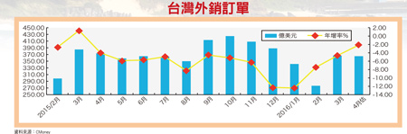 外銷訂單最快五月才有機會正成長回歸基本面觀察,攸關上市櫃整體營收好壞的台灣外銷接單數據,三月外銷訂單三六六.二億美元,雖年減四.七%,但為二○一五年十月以來最小減幅,優於預期。未來需密切留意的是對中國大陸接單部分,三月來自大陸訂單已連續十六個月衰退,主因為大陸供應鏈崛起取代我廠商接單空間,包括精密儀器、傳產塑化產品接單不順,現階段只能靠電子與資訊產業苦撐。目前最令人擔憂的是,經濟部預測四月接單約三五五至三七○億美元,仍將低於去年同期水準,可能出現連十三黑紀錄,將打破金融海嘯時期的十二黑,創下外銷訂單最長衰退期,預估接單年增率最快要等五月才有機會轉正。主要原因是全球經濟復甦不夠明顯,面板存在產能過剩問題,筆電需求續減,加上蘋果組裝代工訂單是否拉升仍須持續觀察。經濟部表示,根據受訪廠商對四月接單看法,業者認為接單金額將較三月略減,年減幅度介於二%~四%。台灣未來最大的隱憂是競爭力提升速度太慢,根據官方資料顯示,台灣第一季對中國大陸與香港出口衰退一五.八%,遠遠高於大陸整體進口下降的八.二%,反映台灣產品在大陸市場競爭力可能出了問題,這是投資人甚至新政府團隊必須正視的局面。