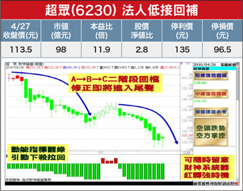 超眾(6230)為國內最大散熱模組廠之一,核心競爭力為熱管設計與製造能力,熱管百分之百自製。主要利基題材有:(1)業績長紅,獲利連三年創歷年新高:受惠規模經濟放大、高毛利率伺服器散熱模組佔比拉高,不僅去年第四季毛利率表現突出達二七%,年增二.五個百分點,季增二.一個百分點,全年EPS達七.七七元,再攀新高,公司也豪氣拿出逾七成獲利與股東分享,擬配發五.五元現金股利,以四月二十六日收盤價一一五.五元計算,殖利率高達近五%。(2)首季業績亮眼,全年力拚一個股本:三月營收六.四七億元,月增四六.九二%,年增四九.九九%,優於市場預期,首季營收達一七.四二億元,年增三二.七%,除了既有伺服器散熱產品持續穩定成長外,拜高階智慧型手機採用微型熱導管之新應用趨勢逐步開花結果,超眾微型熱導管良率逾九○%,高居國內微型熱導管供應商之冠,加上台灣廠及大陸昆山廠自動化生產比率甚高,良率優於對手,在毛利率可望持續走高及產能可望逐步擴大下,今年營運再造高峰可期。(3)股價自三月二日一七二元高點回檔修正以來,趺幅達三八.三%,亦符合黃金切割率○.五回檔比例,加上年線及去年十二月二日缺口九七.三元至一○三元附近支撐強勁,逢低可隨時留意止跌反彈契機(基本面資料若有異動,依公開資訊觀測站最新訊息為主)。操作建議:低接不追高,守穩年線九六.五元關卡不破,逢低可以留意,或可參見「財神系統」之多空訊號進行短線價差操作,設好停損停利。
