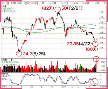 茂迪(6244)太陽能電池年產能3.2GW,是國內太陽能電池最大供應商。產業經歷五年的殺價淘汰賽,體質弱的逐一退出市場,近期傳美國最大的太陽能系統廠Sun Edison(愛迪生)破產重整,茂迪卻發布首季EPS一.六八元,創五年來單季新高。太陽能電池報價連七季上揚,茂迪由一○三年第三季毛利率負一三.七九%到一○四年第三季七.二六%損益兩平,今年首季毛利率一四.三八%,又比去年第四季成長○.四三%,加上大陸搶裝機潮需求,茂迪三月營收三二.四二億,年增一九五%,首季營收九六.二億,季增一五.四%,年增一二九%,創造首季EPS一.六八元的五年來最佳單季獲利。如果太陽能電池報價持穩,茂迪今年全年有機會重登五~七元的高獲利。茂迪挺過五年虧損,今年有機會重返高獲利,股價目前正處低檔,是投資的機會。一○四年財報每股淨值二九.三八元,四月二十六日收盤三二.八元接近淨值,若以今年估EPS五~七元計算,本益比只有五~六倍,股價偏低。配合線型的時間循環分析:前一波八月二十五日二四.二元漲到十二月二十一日五十元共八十二天,接下來跌到四月二十二日二九.八五元共八十天,兩波段時間幾乎相同,加上日線KD指標於二十以下黃金交叉,周線KD也在二十以下,所以完成大波段反轉的機會很大。四月二十六日財報發布後當天大漲七%,且成交量二○八七七張是一年來最大量,底部大量是好現象。辦現增五千萬股,每股認購價三十一元。