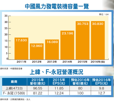 再生能源是中國政府全力發展的產業,其中風力發電更是重要的一環,儘管因為基礎電網建設不足等因素,使得中國「棄風」現象也是高居全球首位,不過,中國官方也已全力解決,預料風力發電相關類股包括上緯(4733)、F-永冠(1589)營運將在下半年出現明顯成長。主攻風力發電機葉片樹脂的上緯董事長蔡朝陽不諱言,儘管中國在二○○五年通過了再生能源法,宣示要讓再生能源能優先併網,不過並沒有強制力,同時又因為三大因素,包括一、基礎電網不足,電力無法併網;二、各省之間的本位主義仍重,沒有人願意為其他地方政府作嫁;三、再生能源與傳統發電產業的競爭,導致中國的棄風現象還是很嚴重。不過,蔡朝陽也指出,中國中央政府已經開始插手,畢竟再生能源是中國既定政策,不容挑戰,因此官方才會大膽釋出二○一六年的風力發電裝置容量,仍將達30GW以上的目標(見附圖),預料下半年開始,棄風問題將逐步解決。上緯強化與金風合作不過上緯依然全力布局中國風力發電市場,由新疆金風科技子公司中國金風投資控股公司以每股一二.二七元人民幣(約新台幣六一.三五元),投資上緯子公司上緯(上海)精細化工三億元人民幣(約新台幣一五億元),將取得上緯(上海)精細化工增資後一○%股權。蔡朝陽指出,由於金風科技一直想要整合供應鏈,早在八、九年前,金風就有投資樹脂相關廠商,而未來上緯就能切入金風科技的其他葉片供應商,拓展新客戶,並共同開發新產品,以擴大在中國風電材料市場的市占率。除了中國風力發電市場外,上緯也積極投入離岸風力發電市場,轉投資公司海洋風力發電日前取得經濟部能源局發出的首張海上風力發電機組電業設置發電設備工作許可證,蔡朝陽指出,六月將完成基樁架設、七月完成吊樁,二○一六年將有兩台風力發電機正式商轉。上緯第一季受到淡季影響,風機裝機量下滑,因此祭出了產品降價回饋客戶,因此也影響了單季營運,包括營收僅一二.四二億元,年減率三六.六五%;稅後純益三三九四萬元,年減率八○.二%,每股稅後純益○.三九元。
