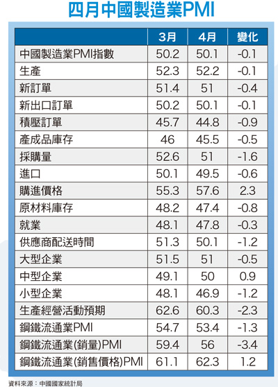 四月中旬大陸持續公布許多重要經濟數據,如進出口、CPI、PPI以及第一季GDP等,基本上都符合甚至超過市場預期。但上證指數近期仍在三千點附近作區間震盪,三月以來的反彈只能說是弱勢反彈,相對於官方的經濟數據表現良好,確實讓投資人感覺有明顯落差。復甦力道不強 改善持續進行中是基本面復甦強度不夠嗎?五月一日中國官方公布了四月製造業採購經理人指數PMI為五○.一%,較前值五○.二%和市場預期的五○.三%略低一些,不過至少連續兩個月位於榮枯線五十上方,象徵製造業景氣微幅擴張(見附表)。