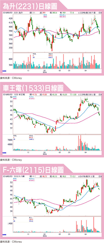 美國聯準會降息稍減,使得各國貨幣兌美元起了變化,包括日圓、韓圜、人民幣與新台幣,在國際熱錢湧入下,紛紛升值。美國聯準會FOMC利率會議宣布維持利率在○.二五%至○.五%區間不變,而蘋果改單壓力等利空籠罩下,外資賣單是否減輕,是大盤能否止跌的關鍵,端視外資在五月份淡季是否持續加碼台股而定。原物料反彈 科技業新推手看車電預期外資目前還握有三萬多口的未平倉多單。另外,也要觀察五二○之後,本土法人與股市大戶是否歸隊為依據。觀察農曆年後各類股表現,橡膠、鋼鐵、玻璃、陶瓷及水泥類股都有一五%以上的漲幅,明顯大於加權指數六.二二%的漲幅,從中鋼(2002)、台泥(1101)、台塑(1301)、東陽(1319)、台化(1326)、遠東新(1402)等,年初至今,外資一路大買上來,加上最近油價回穩,原物料反彈,中國三月新車銷售表現優異,一線城鎮房市開始轉強,在在都有利拉抬橡膠、鋼鐵、水泥等內需股走勢。非原物料類股中,仍以汽車電子及零組件為主,例如同致(3552)的倒車雷達列入新出廠汽車基本配備,股價從三○二元一路漲到近期最高五九五元,漲幅將近一倍,所以汽車電子可望成為台灣科技業成長的新推手。汽車電子因為安全與法規限制,進入障礙及相對訂單能見度較高,加上客戶端均為全球汽車大廠,對品質及安全要求更高。同致大漲之後,接下來像胎壓檢測器為升(2231)、車王電(1533)、F-六暉(2115)之前打入供應鏈,將不易被取代,預估將是下半年投資焦點之一。在汽車板品質上的要求,不良率為零,其認證時間都達三年以上,技術進入門檻非常高,訂單亦多往五大車廠集中,目前全球前三十大車廠都是敬鵬(2355)客戶,因下游訂單穩定性相當好,可望在未來優先取得訂單。至於蘋概股,雖然最近因利空襲擊,但如果今年iPhone 7賣不好,台灣商品貿易有三分之一跟電子零組件有關,等同台灣整個蘋果供應鏈都將被波及,最近像大立光(3008)、可成(2474)、和碩(4938)等,股價已轉為空頭,建議短期先避開為宜。不過,台積電(2330)去(二○一五)年因二十奈米製程運轉成功,搶占應用處理及基頻市場,營收攀高至二六五.六六億美元,年增五.五%,市占率也自二○一四年的五三.八%擴增至去年的五四.三%,穩居全球晶圓代工龍頭寶座。而全力衝刺的十六奈米先進製程,成為蘋果忠實夥伴,今年繼A9處理器大放異彩,股價破季線,急殺可注意買點。