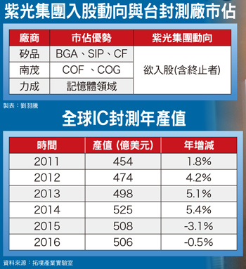 中國大陸紫光集團入股矽品案出局後,同是紫光參股目標的台灣封測廠,目前僅剩南茂、力成還站在壘包上,待投審會擊出好球通過入股,但民進黨領導的新政府團隊將走馬上任,對中資入股國內封測業採防堵策略,恐將使入股南茂、力成也遭出局。法人從國內封測廠製程推測,矽品案終止後,除使封測一哥日月光穩住IC封測市占外,也間接使製程與南茂、力成相似的頎邦起死回生。中資入股台封測業剩力成、南茂待審,矽品於四月下旬的法說會前發文宣佈,公司考量主客觀因素後,決議終止與紫光集團簽署認股協議、策略聯盟契約。從董事長林文伯法說會後對記者的言論來看,終止去年底剛提出的認股協議,恐與已經變天的國內政壇有密不可分的關係。林文伯表示,新政府對於兩岸政策尚未明朗,且私募協議存在進度壓力,為避免協議案造成雙方困擾,才決定撤銷,待情勢明朗後再做考量。至於紫光入股力成、南茂目前進度?力成董事長蔡篤恭於四月下旬的法說會上未明確答覆,僅表示二○一六年度所有計劃案的資金皆已備妥,故無論紫光入股案成功與否,都不會影響今年度的其他規劃。南茂董事長鄭世杰則是在今年初的股東會上表示,南茂若成為紫光的合作夥伴,公司將能受惠紫光集團在面板、記憶體市場所布局的版圖。而掌握外國資金入股台灣產業生殺大權的經濟部投審會則表示,基本上紫光集團與矽品兩方的認股協議,未來不會再復出,而中資有意入股的南茂、力成,目前才剛要進行書面審查。此外,有消息甚至指出上述二者將合併審查。日月光全球IC封測市值上升從中國大陸紫光集團欲入股台灣封測業製程來看,不難發現中資欲布局的封測業已囊括所有封測版圖,以上周剛撤銷的矽品案來說,其IC封測在全球市佔約六%,稍微落後日月光的9%。二者製程主要是各式球閘極陣列封裝(Ball Grid Array,簡稱BGA)、覆晶封裝(Flip-Chip,簡稱FC)、系統級封裝(System in Package,簡稱SiP)等等。由於封測雙雄製程、產品重疊度相當高,故法人推測,矽品撤銷紫光參股案後,矽品原本能享有龐大中資金援幻滅後,日月光全球市佔將提升。據拓墣產業數據顯示,二○一六年全球IC封測產值約五百億美元,約與去年持平。市場法人以矽品全球市佔六%計算,矽品今年能擁有的全球產值約三十億美元。由於矽品短時間內難出現比日月光持股還大的股東,故日月光將分食上述三十億美元產值,以其佔矽品股權逾三○%計算,將分食九億美元,再加上,日月光IC封測原本佔全球九%的四十五億美元,今年日月光能享有的IC封測全球產值,將提升到五十三億美元。至於紫光集團欲入股的另外兩家台灣封測廠,南茂、力成則是擁有日月光、矽品沒有的特殊製程或是其他市場策略,特別是紫光欲入股二五%的南茂用於面板驅動IC的COF(Chip On Flim)、COG(Chip on Glass),即是封測雙雄所未具備的。