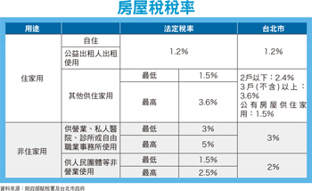 今(二○一六)年房屋稅已於五月一日開徵,不少納稅義務人在四月底前都陸續收到稅單,民眾可以檢視上面,有關「住家」或「非住家」的適用上,有沒有出現錯誤,以免多繳稅;而今年房屋稅開徵情況,根據財政部的統計,全國房屋稅開徵件數總計八四三萬件,稅額為七一六億元。財政部表示,房屋稅繳納期間為五月一日至五月三十一日止,而根據房屋稅條例第四條規定,房屋稅向房屋所有人徵收之;其設有典權者,向典權人徵收之;共有房屋向共有人徵收之,由共有人推定一人繳納,其不為推定者,由現住人或使用人代繳。 囤房稅率高達三.六%另根據第五條有關稅率規定,房屋稅依房屋現值,按下列稅率課徵之: 一、住家用房屋:供自住或公益出租人出租使用者,為其房屋現值百分之一點二;其他供住家用者,最低不得少於其房屋現值百分之一點五,最高不得超過百分之三點六。各地方政府得視所有權人持有房屋戶數訂定差別稅率。二、非住家用房屋:供營業、私人醫院、診所或自由職業事務所使用者,最低不得少於其房屋現值百分之三,最高不得超過百分之五;供人民團體等非營業使用者,最低不得少於其房屋現值百分之一點五,最高不得超過百分之二點五。三、房屋同時作住家及非住家用者,應以實際使用面積,分別按住家用或非住家用稅率,課徵房屋稅。但非住家用者,課稅面積最低不得少於全部面積六分之一。前項第一款供自住及公益出租人出租使用之認定標準,由財政部定之。上述房屋稅稅率於二○一四年六月有新修正,其中最關鍵的部分為「各地方政府得視所有權人持有房屋戶數訂定差別稅率。」(附表)主要是為過去十多年房市大多頭,不少投機客炒房,造就房價高漲,而政府為抑制飆漲的房價,自二○一一年六月實施「奢侈稅」,二○一二年八月實施「實價登錄」,台北市除了實施「豪宅稅」後,透過調整房屋稅的稅基,再搭配立法院三讀通過稅率的調整,使得二○一四年六月修正通過的房屋稅稅率,除自住用房屋維持百分之一.二外,針對「非自住」住家用房屋稅率,由原本的百分之一.二至百分之二,大幅提高至百分之一.五至百分之三.六。而「各地方政府可視所有權人持有房屋情況訂定差別費率」,也就是針對多屋族在全國持有超過三戶(不含)以上房屋者,實施了「囤房稅」,最高可課至百分之三.六。