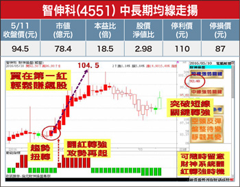 金屬精密零件加工之代工廠智伸科(4551),主要利基題材有:(1)首季營收與獲利雙創新高:首季營收八.四五億元,稅後淨利一.○四億元,EPS一.二七元,皆創歷史單季新高。公司派表示,受惠旗下三大主力汽車產品第一季都有良好銷售表現,汽車營收占比六二.三二%,其中汽油高壓泵浦去年第四季起進行產品調整,低毛利產品汰舊換新及製程持續改善效益逐步顯現,帶動整體營業毛利率從去年同期一九.一八%大幅提升到二八.八三%。(2)四月營收衝次高,今年業績逐季成長可期:四月營收三.○四億元,月增四.三七%,年增一五.六六%,累計前四月營收一一.四八億元,年增一一.一四%,創歷年新高。受惠全球汽車品牌車廠加速燃油效率、引擎效能提升及先進駕駛輔助系統技術導入等研發技術進程,缸內直噴引擎(GDI)技術及相關主動式安全零組件滲透率提升,帶動智伸科旗下汽車動力及安全關鍵零組件產品出貨成長優於滲透率,有助第二季營運表現可望淡季不淡。下半年傳統旺季來臨,及高毛利汽油高壓泵浦產品占比持續提升,營收、獲利與毛利率亦可望逐季攀升。另外,包括雙離合器及ESC(電子行車穩定系統)等新產品,隨著新車搭載滲透率提升,亦將成為營運長期成長動能(基本面資料若有異動,須依公開資訊觀測站最新訊息為主)。操作建議:低接不追高,在不破前低八十七元關卡前提下,逢低於十日均線附近可留意,或可參見「財神系統」之多空訊號進行短線價差操作,設好停損停利。