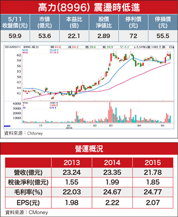 高力(8996)是全球前五大熱交換器廠商,熱能產品約佔五八%、板式熱交換器佔三三%,板式熱交換器用於大型空調及冷水機冷卻,熱能產品則主要出貨給美國燃料電池大廠Bloom Energy。燃料電池是一種能源轉換發電裝置,燃料不經過燃燒,可直接以電化學反應方式,將化學能直接轉為電能,能源轉換效率高。高力燃料電池主要特色包括:氫燃料電池發電系統透過化學反應產生電力同時也產生熱能,可同時供應家庭需要的電力與熱水,目前包括蘋果、Wal-Mart、Google、eBay、Coca-Cola等都有採用Bloom Energy的SOFC燃料電池,間接成為高力的客戶。燃料電池是二十一世紀新發電趨勢,發電量從幾瓦到幾千瓩,可取代手機與筆電的電池,也可使用在汽車與機車儲能,除了可當作家庭發電機、購物中心與雲端資料中心的電力來源外,還可以與太陽能、風能等再生能源整合成分散式電力的智慧電網。一台家庭燃料電池系統一年約可減少一.五噸二氧化碳排放,比傳統能源減少三五%能源使用與四八%二氧化碳排放,符合環保、綠能、低碳排放的要求。此外,氫氣為環保新興能源,在先進國家積極推動下,預計二○二五年將成為全球最大能源科技產業。高力亦投入氫能燃料電池技術研發,並於二○一四年推出家用、商用的燃料電池發電系統,及熱泵、LED、熱交換器等多種節能產品;未來在氫能逐漸成為趨勢下,成長潛力值得期待。操作建議:股價三月初進入高檔整理,經過兩個月調整後,五月五日一根帶量長紅棒打破整理型態,中多架構儼然開展,可趁震盪時逢低介入。