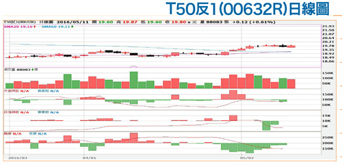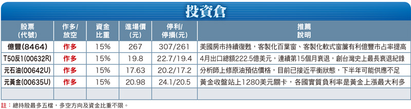 億豐(8464):營運成長股。主要生產竹製窗簾,後陸續開發各式百葉窗、窗簾及各種窗簾零件和裝潢材料等,是全球窗簾業界的主要領導廠商,二○一六年以來美國房市復甦趨勢延續,如Home Depot股價的創新高,法人也在注意房屋修繕類股的爆發潛力,而億豐營收近八○%來自美國市場,其客製化百葉窗、客製化軟式窗簾等中階領域產品營收比重將進一步拉高,有利於億豐市占率的提高。T50反1(00632R.TW):台股基本面表現不佳,國發會公布三月景氣燈號,續亮代表低迷的藍燈,已創下連十藍、追上金融海嘯時期的紀錄,技術面拉回整理,後市有轉為偏空的疑慮。元黃金(00635U.TW):國內首檔商品期貨ETF,美元疲弱,股市下跌,黃金因而獲得支撐。六月黃金收盤站上一二八○美元關卡,突破了近來的整理走勢。各國的實質負利率,是黃金上漲的最大利多。下個月,若黃金上漲至接近一四○○美元,將不足為奇。元石油(00642U.TW):路透社所做調查顯示分析師普遍開始上修今年原油預估價格,目前平均來到四二.三○美元連續兩個月成長。投資銀行Jefferies也表示,目前油價已經讓市場接近平衡狀態,下半年開始可能轉為供應量不足。美國銀行(BAC-US)美林證券分析師也表示,他們預估從四月五月份開始全球原油產量將會逐年減少。