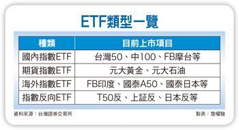 布局海外超容易 散戶救星ETF對此,證期局副局長張麗真指出,台灣掛牌的ETF,追蹤台股有十四檔、追蹤海外股市的有十檔、一檔追蹤陸股,相較過去ETF主要追蹤國內指數,近年ETF商品多元化,現在已有追蹤陸股、韓股、日股、美股、港股以及石油、黃金等商品ETF,滿足投資人需求,也因為如此,讓ETF占台股交易量一舉成長三個百分點,交易量比重迅速突破一成,成為台股市場中的當紅炸子雞。看準這股趨勢,各家投信紛紛推出各式各樣的海外ETF,光是在最近幾個月中,就有追蹤「印度NIFTY」指數的富邦「FB印度」、「印度2X」、「印度反」,追蹤「富時中國A50指數」的「國泰A50」、追蹤日本「日經225指數」的「國泰日本傘型ETF」等多檔上市,供投資人布局海外市場。對此,國泰ETF基金經理人游日傑指出,五月以來,在各國公布的政策方向不如預期之下,全球市場的整體上漲動能減弱。不過中國仍然持續針對金融市場開放努力,估計在中國政府政策偏多的情形下,對投資海外ETF有興趣的投資人可以利用國內投信發行之陸股相關ETF,分批進場參與。截至目前為止在台灣上市的ETF已經多達四十四檔,可供進行各式多元化的操作,來滿足投資人的需求,這股ETF風潮你絕對不能錯過。