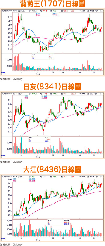 葡萄王(1707):食品、藥品、飲料產銷大廠,第一季累計營收二○.○九億元,毛利率八八.二八%,營益率二三.九○%;合併稅後盈餘二.八三億元,年增一九.○八%,EPS二.一七元。公告四月營收七.四二億元,月減一二.八六%,年增二○.一二%;累計一至四月營收二七.五億元,年增二一.一八%。葡萄王受惠持股六成以上的子公司葡眾開始進入「聘級升等」旺季,與中國成藥大廠雲南白藥的合作案亦有望開始出貨,預估第二季營收上看二十二億元。另一股營收貢獻挹注力道,則來自葡萄王本身,今年預計將推出「晶透雪亮飲」、「田七馬卡王精華飲」,後者為性功能障礙輔助新品,預計五月起上市。上海葡萄王發展方面,受惠中國大健康商機熱潮,也已獲得一定代工訂單,業績穩定加溫中。受惠三大市場商機規模同步成長,法人預估,葡萄王全年將獲旗下三大事業體交出雙位數營收成長佳績挹注,營收增幅最高有望達一五%,EPS有望達九元以上。日友(8341):醫療及有害事業廢棄物處理大廠,第一季累計營收四.五五億元,毛利率五六.九二%,營益率四一.○一%,合併稅後盈餘一.四二億元,年增五四.九四%,EPS一.二八元。公告四月營收一.四一億元,月減八.一七%,年增○.一七%;累計一至四月合併營收五.九七億元,年增達一六.九二%。日友去年營收業務占比,四九%來自事業廢棄物,四二%來自醫療廢棄物,專案工程約六%,廢乾電池回收處理約三%。日友指出,預估今年專案工程營收金額仍將持續增加,接下來幾季陸續認列入帳。法人統計,日友過去每年由專案工程業務貢獻營收約一億多元,預估今年亦將維持原有水準。另外,去年物化業務產能稼動率已自一五%拉高至二○%,由於原有設備產能於部分廢棄物處理仍供應不足,四月調整設備完成、加入量產行列後,今年物化稼動率目標將提高至三○~四○%,力拚五○%,順利的話,推估對整體營收貢獻度將有機會進一步提升最高至八%,營收有望倍數成長。日友目前八、九成以上客戶均採每年一約模式,且市況仍供不應求,企業客戶為符合環保法規要求,大多尋求大廠協助進行廢棄物處理事宜,造就廢棄物處理呈現明顯賣方市場,使得廢棄物處理價格每年有機會穩定提升。第二季開始,既有物化業務可望擴大接單量,雲林三廠倍數擴增產能將於第四季上線量產,法人預期日友今年營運逐季成長機會大,全年營收也有望持續成長。推估日友今年營收年增率約一五%,全年EPS有機會上看五元以上。大江(8436):保健食品及美容保養品產銷專業廠,第一季營收六.四億元,續創歷史新高,年增五二.五四%;稅後淨利○.八四億元,年增率大幅成長達一.四八倍,EPS一.二六元,同創掛牌以來單季次高。公告四月營收二.四三億元,創歷史新高,月增五.四九%,年增六○.六七%;累計一至四月營收八.八三億元,年增五四.六九%。在中國目前各項發展計畫中,最鼓勵發展政策即為「大健康」、「大數據」相關應用產業。大江指出,中國保健、美容產品市場才剛起步發展,由於市場規模龐大、影響力深遠,任誰也無法忽視。