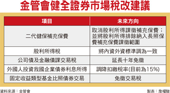 金融稅制改革 擬降四稅一費七大主軸壓軸好戲,就是民眾最關心的稅制及費用問題,雖然「稅」的部分不屬於金管會職掌,不過仍在金融白皮書中提出「四稅一費」建議,為業者請命,包括「股利所得應內資外資一致」、「持續停徵公司債交易稅」,「取消股利所得課徵補充保費」等,以促進證券市場發展。金管會指出,內資外資租稅負擔存在差異,造成不公平現象,外資只需按20%分離課稅,內資的稅負成本遠高於外資,造成假外資橫行,建議財政部不論分離課稅或兩稅合一,內外資都要一致,以免造成不公平現象,此外,金管會也建議修改證交稅條例,在十年內持續停徵公司債與金融債券證交稅,提升投資意願。另外在費用方面,金管會也建議取消二代健保對股利所得課徵補充保費,以活絡債券市場,此外,更建議將長照及年金保費列為扣除額,以幫助證券市場發展。