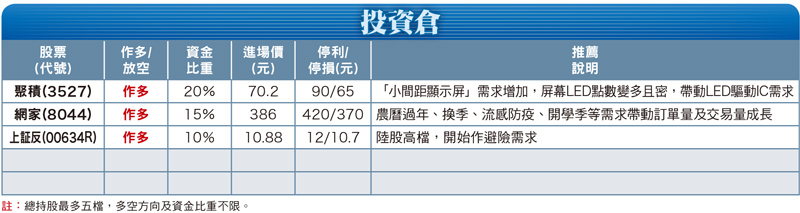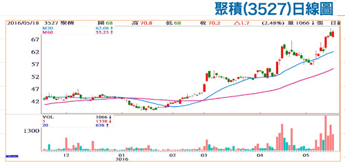 在五二○不確定因素消失後,台股未來何去何從?基本上台股應該要走向基本面行情的道路。由於最近成交量明顯萎縮,而過去五二○前後台股的表現都不甚理想,是因為電子業都處於業績低迷期,需要到第三季左右才會有好的表現。這是產業的宿命,也是股價可以打雙底的時間。事實上,操作金融商品講求的是時機,未來如股東會旺季、中國A股納入MSCI指數、英國脫歐公投等等,都將影響全球股匯市走勢,台股操作難度的確增加。聚積(3527)為IC設計公司,產品主要為LED驅動IC,應用端以顯示屏為主,其他應用包括建築照明、電視背光以及一般照明。至於營收占比,分別為:顯示屏約占九○%、LED照明約占一○%。聚積為全球第一大LED顯示屏驅動IC廠商,全球市占率超過五成,在大陸市場市占超過六○~七○%。網家(8044)今年第一季的成長動能,主要是受到農曆過年、換季、流感防疫、開學季等需求,帶動訂單量及交易量成長。進一步分析其商品銷售狀況,因適逢換季,家電需求提升,小家電館銷量第一季相較去年第一季成長五五.二%;而生活館受到過年期間除舊布新、人身安全議題等影響,寢具、防身用品熱銷,也帶動生活館第一季銷量相較去年第一季成長五二%。