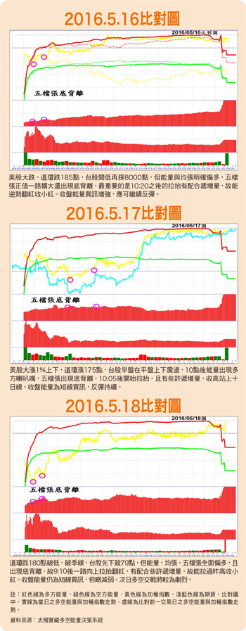 上周本欄已說明五月十一日早盤高點八二○四點為極短線反彈高點,還要再下探八○七五低點,甚至八千點大關。果然上周四(五月十二日)、上周五(五月十三日)連續下跌。上周五台股上半場一路下殺小破八千點,但有殺出低檔承接量,十一點零八分後多方能量上升,空方能量走平衰退,拉出五十四點下影線。收盤能量為短線買訊,配合周線為八八四○點下跌第八周時間轉折,表示五月十六日開始反彈向上的機率大。上周五美股大跌,道瓊跌一八五點,本周一(五月十六日)台股開低再探八千點,但能量與均張明確偏多,五檔張正值一路擴大還出現底背離,最重要的是十點二十分之後的拉抬有配合遞增量,故能逆勢翻紅收小紅。收盤能量買訊增強,確認由此開始進入六至八天的多方發球區。五月十七日美股大漲一%上下,道瓊漲一七五點,台股早盤在平盤上下震盪,十點後能量出現多方喇叭嘴,五檔張出現底背離,十點零五分後開始拉抬,且有些許遞增量,收高漲七十二點站上十日線。收盤能量為短線買訊,反彈持續。五月十八日因道瓊跌一八○點破低、破季線,台股先下殺七十九點,但能量、均張、五檔張全面偏多,且出現底背離,故九點十分後一路向上拉抬翻紅,有配合些許遞增量,故能拉過前一天高點收小紅。收盤能量仍為短線買訊,但略減弱。估計十九日多空交戰將較為劇烈。尤其十九日晚上Fed會議結果不明,近期鷹派不斷放話,六月升息機率增加,且美股當晚為拉回第二十一天時間轉折,不排除道瓊有下探一七四○○點支撐的可能,台股仍有可能受影響再探十八日低點。