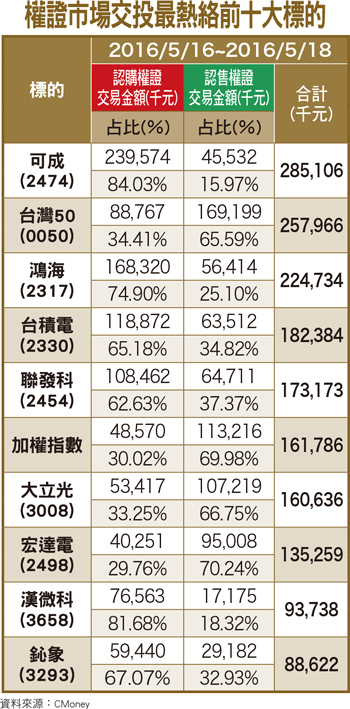 大盤量縮,權證整體金額也明顯下降。外資本波從四月二十八日至五月十七日累計賣超已達一千一百億元,後續還有兩岸關係、A股可能納MSCI指數及英國脫歐公投等國內外變數干擾,外資普遍保守,也和本周權證市場相互對照。指數類權證仍是本周排行榜顯著指標,但延續前幾周基調,認售權證熱度仍遠大於認購。另一個現象是先前修正較大的蘋概,出現打底現象後,認購權證比率持續攀升,可成認購認售從上周七比三再拉大到八比二;鴻海擬配發五元股利,為九年來新高。蘋果預計九月發表新款旗艦機種,能否重新帶動市場對蘋概股評價,將是下半年重頭戲。 本周還可以觀察聯發科(2454),旗下大陸轉投資傑發科技賣給四維圖,預估處分利益將達一二○億元,交易預期第四季生效,股票因此重大訊息停止交易一天,恢復交易時並無明顯反應,但以權證市場來看投資人認為股價在低檔區有機會反彈的居多。從市場統計來看,雖然大盤量縮權證成交金額也略微下降,在市況不明情況下,其低權利金高槓桿特性仍相當有特色,投資人在可承受風險下以適當金額投入,有機會擴大獲利。