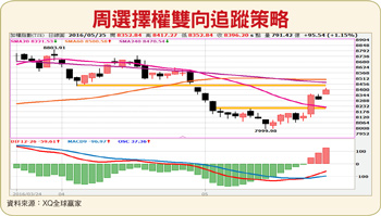 美股受到英國脫歐機率下降以及經濟數據表現良好影響,四大指數皆重回漲勢。從技術面來看,道瓊指數雖然尚未突破下降趨勢線,不過費半指數已經強勢突破前高,在科技類股的帶動下,道瓊指數仍然相當有機會繼續上攻。市場目前最關注的訊息就是聯準會六月份是否會實施升息,從經濟數據來看,美國商務部公布四月新屋銷售連續二個月成長,創二○○八年一月來新高,新屋價格也同時呈現大漲走勢。加上聯準會(Fed)舊金山聯邦準備銀行總裁威廉斯(John Williams)表示:「經濟狀況可以承受一次升息,對經濟不致造成太大衝擊」。整體來看六月份升息的機率一直在升高。台股在新政府政策作多下,加上美股大漲,盤勢持續走高,本周成分股在法人回頭補庫存的買盤推波助瀾下,漲勢整齊且穩定。從指標DMI來看,盤勢已經轉為多方控盤,多方力道持續加強中,台股還有繼續上攻的機會。目前台股壓力落在年線,五月二十三號的長紅突破形成重要支撐。三大法人合計期貨淨多單,外資期貨仍為淨多單,目前期貨未平倉淨多單三萬五千三百三十口,前十大交易人多空比大於一,觀察自營商選擇權部位,買進買權及賣出賣權,從外資期貨部位和自營商選擇權部位來看,顯示法人對後市看多,可布局溫漲(買權多頭價差)策略因應。
