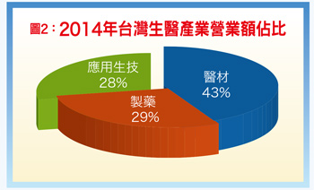 新藥研發耗資費時 尤需政府關愛經過多年努力,除了政府投資之外,二○一四年民間對生技產業的投資已經超過四五八億元,比前一年成長約九%。而截至二○一五年六月底,經過審定為生技新藥公司有八十七家,已於上市櫃及興櫃登錄交易的生技公司有三十八家,經審定屬生技新藥的品項有二○九項,取得上市許可之生技新藥有二十九項。在營業額方面,二○一四年國內生醫產業營業額約為二八八六億元,較前一年成長四.二%,其中將近半數營業額是來自於醫療器材產業(圖二),製藥產業與應用生技產業的營收則相當。生技醫藥產業是屬於資金密集、技術密集、專業密集的產業,就以新藥研發來說,平均研發經費超過十億美元,研發時間超過七年,甚至長達十年以上。由於投資金額大、研發時間長、成果不確定、價值不確定、回收時間長等等產業特性,使得該產業在研發資金的取得上並不容易,也因此更需要政府的投資或補助。而我國一直以來對生技產業即提出許多獎勵與補助措施,甚至提供上市櫃推薦,讓業者能夠在資本市場中募集研發及營運所需資金。