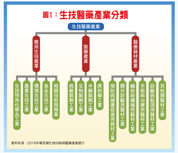 本期主題「生技醫藥」,是蔡英文「五大創新研發計畫」與中國「十三五規劃之中國製造2025」中第三個重疊的發展目標。隨著科技進步與經濟成長,人類的壽命延長,生活品質也不斷提升,但是長壽與富裕的生活也為人類帶來了許多疾病的困擾,而醫藥療效的提升,更使病毒不斷變異,對人類生命造成威脅。為了解決這些問題,生物科技與醫藥技術成為各國致力研究發展的重點項目之一。其實,生技醫藥不僅止於進行與人類疾病相關的研究,運用在農牧業上,可以改善農牧產品的品質並增加產量,解決人類糧食問題;運用在食品上,則可研發與製造保健食品,幫助民眾改善或加強健康狀況(圖一)。國內生技業發展一直頗受重視,但直到去(二○一五)年下半年生技類股大漲時,才真正引起全民關注。事實上,早在一九八二年,行政院就將生物技術列為八大重點科技之一(能源、材料、資訊與生產自動化、生物技術、肝炎防治、光電科技與食品科技),並陸續推動多項計畫及方案,同時制定相關辦法及法規,提供各項獎勵、補助及貸款,鼓勵產、學、研投入生技醫藥產業的發展。
