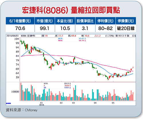 砷化鎵代工廠宏捷科(8086),產品以HBT晶片為主(佔七六%),主要大客戶為美商Skyworks,Skyworks是蘋果供應鏈,而宏捷科是Skyworks唯一的HBT PA晶圓合作夥伴。此外,宏捷科亦透過聯發科(2454)打入非蘋陣營,如大陸4G手機市場,並於去年第二季起出貨PA給三星、小米等客戶。首季EPS一.三七元,較去年同期和前一季衰退,主要原因為Skyworks調整庫存,不過,毛利率雖下滑○.五個百分點,營益率卻逆勢揚升○.六個百分點,一旦蘋果拉貨潮展開,獲利拉升幅度就會加快。根據機構報導,目前iPhone使用超過兩年者約二六%,創史上新高,若以絕對值來算,iPhone 7今年九月發布時,將有一.二億用戶的iPhone已經老舊,應能引來龐大換機潮。事實上從台積電(2330)第二季產能利用率接近九三%(遠高於第一季的八三%)可知,A10晶片對台積營收挹注將從六月開始顯現,亦即屬於蘋果供應鏈的宏捷科其營收動能將自六月開始拉升。此外,受惠車聯網及安全輔助駕駛(ADAS)應用增溫,宏捷科與日廠合作開發的GPS-LNA產品,具GPS定位功能,GPS是手機、相機、汽車和物聯網等主配元件,市場需求大,宏捷科交給Skyworks的PA亦開始導入車用,今年營收占比可望上看一五~二○%,在新產品出貨放量,以及4G智慧型手機持續成長下,今年成長依舊值得期待。