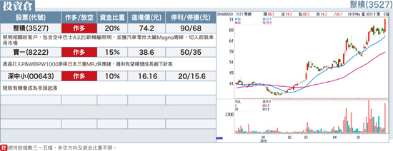 美國聯準會七月升息機率拉高,代表美國經濟正邁向穩定復甦的階段。從基本面觀察,儘管進入電子傳統產業的業績淡季,此波景氣修正從去年開始往下修正,在連續景氣對策訊號亮出代表衰退的十藍燈之後,終於在四月份轉成黃藍燈。只要未來景氣有持續往上的機會,台股應該就是多頭趨勢。最近因MSCI季度調整後生效,整個盤面熱絡起來,未來只要不跌破九百億量能當天低點八一二○點,拉回可以採偏多操作。聚積(3527)為IC設計公司,產品主要為LED驅動IC,應用端以顯示屏為主,其他應用包括建築照明、電視背光以及一般照明。營收占比為:顯示屏約九○%、LED照明約一○%。聚積為全球第一大LED顯示屏驅動IC廠,全球市占率超過五成,在大陸市占則達六○~七○%。寶一(8222)第一季受惠訂單量與零組件品項雙重成長,毛利率走揚三個百分比,費用率亦有改善。展望第二季,四月營收雖有衰退,但寶一仍舊看好整季業績,因CFM56引擎零組件訂單數量與參與品項增加,法人預估寶一全年營收仍有望年增一五%,獲利成長幅度預料更佳。