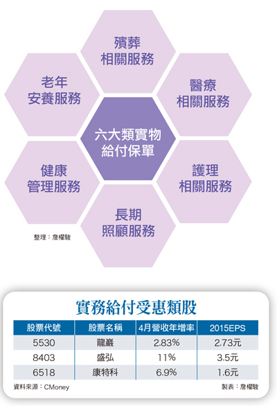 針對實物給付保單,金管會開放「醫療服務」、「護理」、「長期照顧服務」、「健康管理」、「老年安養」、「殯葬」六大類標的,金管會保險局副局長張玉煇表示,除了目前通過審查的富邦「健康檢查」實物給付保單,還有正在審查中的國泰人壽「醫療專機接送」、台灣人壽「健康手環」、新光人壽「健康檢查」等實物給付保單蓄勢待發,未來民眾買保險將有更多的選擇。雖然現在有許多實物給付保單如雨後春筍般推出,但是卻集中在「醫療服務」、「健康檢查」類別,在邁入高齡化社會的台灣最急迫需要的「長期照顧服務」、「健康管理」、「老年安養」、「殯葬」四大項目卻沒有保單推出。金管會壽險監理組研判,「物價」及「利率風險」是影響保險公司推出「實物給付保單」的主因,由於「醫療服務」、「健康檢查」類別契約期間較短,所要負擔的物價風險較低,「長期照顧服務」、「健康管理」、「老年安養」、「殯葬」等四大項目,契約期間動輒數十年,風險評估需要更謹慎,所以還未有業者推出。雖然目前「健康管理」、「老年安養」、「殯葬」等四大項目還沒有實物給付保單,不過在未來推出相關實物給付保單後,預估將會為這四大類的相關業者帶來不小的利潤商機,像是「殯葬」部分,國內最大上市殯葬業者龍巖(5530)在「殯葬」類實物給付保單推出後,可以想見在大量保單團購效應下,可以帶來不小的利潤。首張保單七月上市 考驗民眾接受度此外,在「健康管理」項目上,健康管理公司包含上市的盛弘(8403)以及興櫃的康特科(6518)皆有涉略,在未來「健康管理」類實物給付保單推出後,也是前景一片看好,實物給付保單異業合作所帶來的周邊效應令人十分期待。首張實物給付保單「富邦健康樂」在四月通過審查後,外界預估富邦人壽將在七月推出,由於這是第一張實物給付保單,因此格外受矚目,這張實物給付保單將挑戰社會大眾以往所習慣的「現金支付」保單模式,究竟民眾對「實物給付」保單接受度如何,值得進一步觀察。