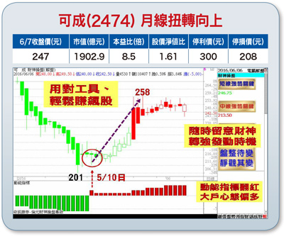 可成(2474)為全球第一大NB金屬機殼供應商,亦是蘋果iPhone和MacBook金屬機殼主要供應商之一。(1)第一季至第二季為谷底,第三季營運將大成長:雖然上半年營運因主力客戶蘋果舊款iPhone銷售疲弱,以及MacBook遞延至第三季出貨影響,第一季EPS僅達五.四元,創七季以來新低,且五月合併營收五八.七八億元,月減二.六%,年減一四.二%,累計前五月營收二八七.五六億元,年減八.二%。隨著iPhone 7及大改款MacBook機殼(平均單價較舊款為高)等新產品重啟新一波拉貨潮的帶動下,預期下半年整體營運成長力道會很強,與董事長洪水樹於股東會釋出下半年營運動能強勁,且六月將邁入新品出貨高峰期看法一致。(2)法人心態齊看多:不僅小摩最新報告為過度低估的蘋概股抱屈,美系外資最新研究報告指出,市場過度擔憂iPhone可能改採曲面玻璃替代金屬機殼,預期金屬在量產、強度方面保有優勢,仍將是不可或缺的機殼材料。歐系外資最新報告亦指出,由於可成工法具領先優勢,仍將是蘋果派金屬機殼廠大贏家,紛紛調高評等。(3)技術面,股價止穩反彈,月均線扭轉向上,低檔量能逐步增溫,法人心態偏多,一旦可放量突破二五八元關卡,將有續往前高或年線挑戰機會。(基本面資料若有異動,仍須依公開資訊觀測站最新訊息為主。)