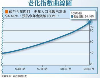台灣是全球老化速度最快的經濟體之一,由內政部人口統計資料的趨勢預估,今年台灣的老化指數將突破一○○%,也就是說老年人口(六十五歲以上)會比幼年人口(十四歲以下)還要多;代表少子化跟高齡化的曲線呈現出黃金交叉。因應總統蔡英文推動長期照護政策,將以指定稅收(營業稅、遺贈稅、房地合一稅)加上公務預算,籌措每年三百至四百億元資金,作為長照體系穩定財源。政府雖積極推動長照保險,但因著朝野意見卻無法達共識。