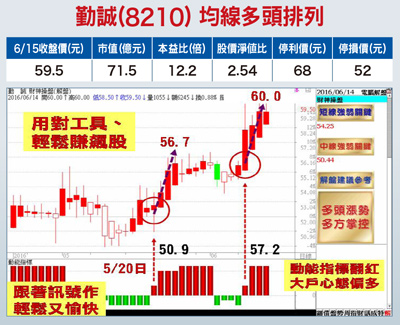 勤誠(8210)主要利基題材有:(1)存儲設備出貨大躍進,第一季毛利率帶勁,第二季可望續揚:受惠英特爾Grantley平台換機潮顯現,美、中資料中心伺服器與儲存設備訂單大幅成長,五月營收五.一五億元再創新高,累計前五月營收二一.四八億元,且首季毛利率來到三○.三五%。雖第一季獲利因有匯兌損失等影響,EPS○.九三元略低於市場預期,隨著美國聯準會升息預期,新台幣兌美元匯率可望相對走貶下,匯損有機會回沖。(2)接單屢傳捷報,第三季業績鳴炮:拿下全中國也是全球最大安防監控設備製造商海康威視的白牌伺服器機箱訂單,成為該公司在中國於曙光、浪潮、聯想之外的第四家客戶,預計第三季開始出貨,貢獻業績。耕耘高階存儲設備亦逐步開花結果,來自美國4U機種訂單大增,預計第二季開始小量出貨,第三季放量出貨,貢獻動能至年底可望持續放大。昆山新廠第三期擴充,預計第三季落成啟用,進入試量產階段。隨著高毛利率產品存儲設備訂單比重可望逐步攀升,以及新客戶訂單第三季開始出貨貢獻營收,配合新產能開出,營運可望逐步成長再創高峰。(3)在短中長期均線走揚向上不變前提下,加上KD隨機指標和MACD趨向指標呈黃金交叉向上,技術面轉強,法人心態偏多,仍有機會續漲再創新高(基本面資料若有異動,依公開資訊觀測站最新訊息為主)。