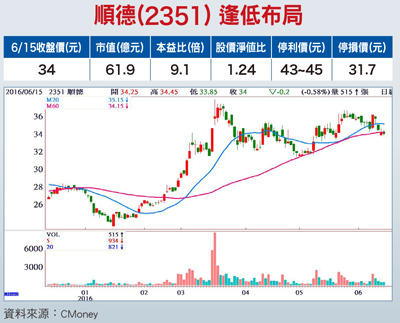 全球前三大金屬沖壓導線架順德(2351),電子材料占營收比重八成,其中,高功率導線架(七○%)、LED導線架(一○%)、IC半導體導線架(九%)、VCM(音圈馬達)金屬彈片(五%)等。順德近年來積極往利基型產品發展切入車用領域,與國際大廠合作開發的車用單體高功率導線架產品已擴大至胎壓偵測器、抬頭顯示器及車用控制、電源模組及影音系統等。隨著安全駕駛需求增溫,帶動車用電子需求湧現,國際大廠意法半導體(ST)、英飛凌及Vishay等均擴大對順德車用單體高功率導線架下單,目前車用占比已超過二成,成長潛力值得期待。此外,順德持股五五%的德輝為日系及大陸VCM廠,主攻手機鏡頭模組(自動對焦)VCM彈片。受惠手機客戶包括宏達電及大陸品牌廠華為、小米等,以及其他非蘋、非三星手機品牌廠雙鏡頭需求增溫(毛利率高達四成),目前德輝接單非常暢旺,訂單能見度已看到第三季。近年來大陸手機品牌開始訴求平價高規的高性價比,導入鏡頭規格由5~8MP移往8~13MP,德輝具八成市占優勢,將可直接受惠。第二季在雙鏡頭及車用產品出貨持續放量,加上國際銅價止跌回穩下,有利順德營收與獲利動能增強,預估今年EPS至少三.五元以上,加上配息二元,低本益比、高殖利率,屬於進可攻、退可守的價值成長股。