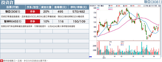 日前MSCI宣布延遲納入中國A股,加上六月二十三日英國脫歐公投,都是屬於近期重大國際事件,金融市場通常都是在跌勢不明確中,才有很多不確定的因素。如果台股是大多頭格局,想必干擾因素會降低許多。所以,投資人不需對不確定因素過度反應,應該冷靜觀察,善用市場大幅度波動,創造更好的投資收益。通常股市急漲後,股價會進入回檔修正整理,急跌後,則通常會出現反彈走勢,因此,在現階段全球低利率的環境下,資金會找尋好的投資機會,找出有漲幅表現空間的個股,持有者相對可以安心。聯亞(3081):光通訊、矽光雲端運用及工業、消費性領域等應用,為公司三大成長動能。對於今年營運展望,聯亞表示,目前公司訂單量超過產能,而且新產品VSCEL和EML都已經準備就緒,預估第三季營收將較第二季大幅成長。在新產品開發方面,目前與客戶密切合作驗證中,計畫於今年底前量產,進一步為明年成長增添新動能。智伸科(4551):主要係受惠於全球汽車品牌廠加速燃油效率提升、引擎效能提升,以及先進駕駛輔助系統(ADAS)技術導入等研發技術進程,缸內直噴引擎(Gasoline Direct injection, GDI)的技術,以及相關主動式安全零組件滲透率得以提升,使得智伸科旗下汽車動力及安全關鍵零組件產品的出貨成長,優於滲透率的表現。