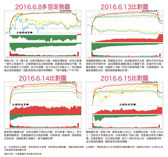 美股上周為一月低點上漲第二十一周的重要時間轉折,波浪型態也走了完整的五波,且除了道瓊指數還差一五一點沒有過高之外,S&P500、NASDAQ及費半指數上周高點都創下今年波段新高。而且周線都收小黑K,周末剛好碰上英國脫歐風險升高,與美國恐怖攻擊雙重利空,本周直接開低向下破上周低點!就技術面而言,此一二十一周的時間波浪大轉折,成功翻空機率不小。若對照歐股來看,德、法股市已連續重挫五天,周線則連三黑且跌破頸線,歐股中期步入空頭應無疑問。亞股當中與台股關係最密切的南韓股市,同樣也在上周衝高過高,見到第二十一周的時間波浪大轉折,本周直接開低下殺破季線、年線,中期翻空跡象明顯。然而,台股比較尷尬,因為台股周線第五、十三、二十一周的三重時間大轉折,不是在上周,而是在本周,若本周衝一個高點,再反轉而下,就會與國際股市相同,但本周一(六月十三日)受國內外多重利空影響(國外利空如上述,國內則有中信金掏空案與美光併華亞科生變的突發利空),造成開盤後連續八個五分鐘盤下跌,為強烈空方盤,最低重挫一九五點,收盤跌一七九點!由於事發突然,主力、法人甚至控盤者都還來不及因應,因此盤面訊號顯然不想讓台股隨國際股市連續重挫,這由本周一當天空方能量明顯下降,五檔張偏多,收盤能量賣訊消失,可以看出。故我在本周一盤中媒體即建議投資人不必殺低,短線應會開始反彈,有反彈到八六○○~八六三四點的機會。果然,歐股連續重挫,美股也持續下跌,但台股周二(六月十四日)與周三(六月十五日)連續反彈兩天,十五日收在八六○六點,正好來到我周一預告的八六○○~八六三四點之間,陸股未納入MSCI,反倒開低走高,大漲一.五%以上,技術線型有打中期W底的機會。因此,未來兩到三天就是台股的關鍵。若出現明確賣訊,甚至能量出現波段賣訊,則台股就是跟隨歐、美、韓中期轉空。而若未來兩到三天完全沒有見到賣訊,那麼台股就可能在八四八八~八六三四點或八六九○點之間進行區間震盪。機率最小的一種是台股不但沒有賣訊,還出現明確買訊,那就表示,台股時間轉折不成立,控盤主力既然出貨不及,乾脆一不做二不休再軋一波空頭,則會再攻八八○○點,甚至八八七二點。不過,即使是這種走勢,軋空完畢也照樣要殺多,甚至殺得更兇!因此建議讀者,要步步為營、謹慎以對,大原則就是逢高站在賣方。