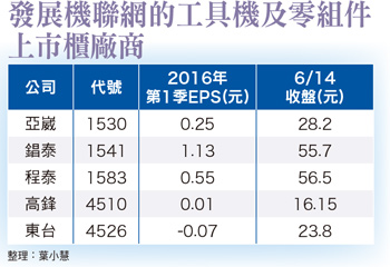物聯網(IoT)浪潮當道,蔡英文政府規劃將物聯網作為ICT產業未來成長主軸,產官學界紛紛進行結盟共創商機。 機械智慧化 效益顯著提升其中,六月初台北國際電腦展中,資策會衍生公司科智企業看好物聯網結合工業4.0,推出機聯網平台,技術由台灣自製開發,結合工業大數據與設備、感知互聯技術,透過軟體自動化採集生產設備資訊,客製符合工廠流程所需應用,可發展智慧化工廠管理,提升人均產值。據指出,機聯網方案目前已導入工具機、航太機械及汽機車相關零組件等製造廠,客戶生產效益顯著提升二○%以上。 工業應用領域進化4.0,競爭力核心之一是智慧機械。機械為工業之母,也是國家競爭力的象徵,工研院工具機中心副主任蘇興川表示,市場習慣的終端產品如3C、汽車、飛機,都是用工具機生產出來,工具機是相當重要的中間設備,是影響一國製造業強弱與穩定的關鍵產業。在物聯網的趨勢下,製造業生產設備將從單機邁向機聯網製造系統。 程泰打進日本豐田汽車 東台建構APP監控管理平台目前國內工具機產業的生產與研發基地都在台灣,CNC車床製造大廠程泰機械(1583)總經理許福助表示,程泰迎接工業4.0,已將產品智能化、增加遠端監控系統、加工模擬系統及自動化系統,其中G.LINC 350除了把機器變聰明,將高階硬體加上軟體及感測器,還自行研發感測元件。今年已將十二台結合特殊夾治具車床邁進日本豐田汽車體系,十二台走新式車床出貨給瑞士SWATCH手錶廠。 工具機大廠東台精機(4526)發展機聯網,也開發出一套TIMS東台智慧製造系統,建立軟體平台,能像手機APP功能對廠內機台監控管理。將以客戶需求為導向,建置整合性平台,從模擬技術開始到創造智慧產線,乃至智能工廠的數位整合,都是未來發展方向。 對於今年景氣,工具機業者看法一致,認為今年維持去年基調,景氣於第一季落底,第二季持平,第三季起回升,逐季增溫。程泰集團旗下兩大工具機廠程泰及亞崴機電(1530)目前在手訂單約五億元,訂單能見度都看到七、八月。東台五月接單也優於四月,訂單能見度也看到七、八月。 看好物聯網時代新商機,程泰、東台兩集團今年同步投資擴建新廠。程泰集團旗下亞崴斥資五億元、程泰斥資六億元興建嘉義大埔美一期新廠,將於第三季動工,二○一七年底前完工;東台斥資六億元興建路竹二廠,預計八月投產,生產大型機台,年產值估十億元以上。