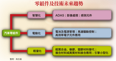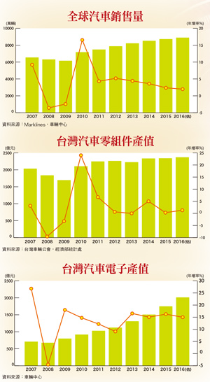 台廠扮全球「銷售後市場」要角根據台灣車輛公會統計,台灣汽車零組件主要生產項目中,以汽車用電燈組產值最大,金額達三四○.九億元、占比一五%,第二大則是輪胎的三一三億元、占比一三%,第三是其他汽車懸吊、傳動系統及零件的二○二‧九億元、占比九%。外銷部份,則是以車燈、車身鈑金、輪胎、後視鏡、輪圈及其他機動車輛的零件及附件為主,台灣所生產的塑膠件、鈑金件及車燈等碰撞件,占全球銷售後市場(AM)市場約八成。根據研調機構Hedges & Company統計,二○一五年全球汽車零組件AM市場規模約為六十三億美元,台灣海關統計資料顯示同年汽車零組件出口值為五二‧八億美元,顯示台灣汽車零組件在AM市場占有極重要地位。例如AM市場塑膠件全球第一廠東陽(1319),塑膠件市占率高達七○%、鈑金件市占率有三三%。全球AM市場車燈龍頭的帝寶(6605),歐洲市占率高達七○%,北美市佔也有四○%。工研院指出,近年中國已成為全球主要汽車消費市場,面對國際主要汽車零組件Tier1廠大多已赴中國投資,台灣業者仍持續鎖定中國Tier 2及Tier 3零組件供應鏈,或是與當地自主品牌車廠共同研發生產,藉此進軍中國自主品牌車廠或AM市場。另針對東協、印度、墨西哥等經濟快速發展的新興市場,台灣業者也在積極佈局,成為長線成長動能的來源。智慧化帶動汽車電子需求隨著汽車的智慧化程度逐年提升,如智慧汽車、車聯網應用、電動車、無人車等發展,汽車電子在汽車中的重要性日益增加。預估二○一六年全球汽車電子市場產值達一三一○億美元、年增四%。由於台灣ICT產業優勢及汽車零組件聚落完整,具備發展汽車電子優勢,台灣產值已由二○○七年的七一○億元,成長至二○一五年的一七五○億元。目前國內3C廠、汽車電子廠及零件廠積極跨入電動車及車用資訊商機,成為台灣汽車電子成長動能。不過,台灣汽車電子廠的產品發展傾重單一零件,多扮演Tier 2供應商角色,須培養整合與智能化實力,提升競爭力與國際汽車電子廠一致,才能晉級Tier 1供應商。ADAS高速成長 鎖定自動煞停及倒車影像系統先進駕駛輔助系統(ADAS)產品在各項汽車零組件中成長率最快,拓墣產業研究所預估二○一五年~二○二○年的年複合成長率達一四.二七%。另根據Lux Research研究,二○一五年ADAS全球市場滲透率約一○%,預估到二○二○年時滲透率將快速提高至五七%。ADAS的主要功能並非是在控制汽車,而是提供駕駛人車輛的運作狀況及車外環境變化等資訊進行分析,進而預警可能發生的危險狀況,讓駕駛人可提早因應,避免交通意外的發生。全球ADAS最大市場在西歐,預估二○一六年將達四○%,其次是北美的三○%,亞太區則占二五%。主因法規是推動ADAS系統高速成長重要引擎,美國強制立法在二○一八年後出廠的新車需將倒車顯影列入標準配備,並在二○一六年起逐步實施,美國前十大車廠也已答應美國政府,未來將自動煞停系統列入標準配備,預計將在二○二一年達成。歐洲則將自動煞停系統與盲區偵測系統列入安全評分的項目,以此來推動ADAS系統搭載率的提升。日本則在二○一六年起,立法強制規定出廠新車需安裝自動煞停系統。由此可看出目前ADAS主要發展重點是放在自動煞停系統及倒車影像系統。