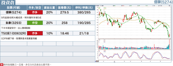 在市場對英國脫歐的利空衝擊淡化下,資金陸續從避險資產撤出,重返風險性資產(當中又以亞股獲得外資回補的情況較為明顯),激勵全球股市上演強勁的跌深反彈行情,印尼股市更已領先改寫波段新高。由於近來亞股的漲跌幾乎都是看外資的臉色,故在在外資操作態度轉向之前,預期亞股仍可維持相對高檔的走勢。就台股而言,因外資期貨留倉多單仍高達六萬口以上,暫時還未有立即反轉的風險。但有一點倒是要小心的,那就是中研院所新公佈的今年台灣GDP預估值,除了數字是目前最低預估值的○‧五二%外(表示今年將較去年衰退),更認為單季成長率高峰將落在第二季,之後將逐季走低,觀點完全與原先市場的預期相反。若中研院的預估是正確的話,隱含下半年台股將存有下修的風險。由於目前多空訊息夾雜,台股後勢發展的不確定性也隨之升高,故操作策略上可採取多空並存的配對交易,用以規避可能發生的系統性風險。本周建議買進股價自低檔轉強的信驊(5274),放空同價位且股價自高檔轉弱的鈊象(3293)。有別於下半年營運展望相對保守及股價技術型態形成頭部的鈊象,信驊因九月開始認列新併購Emulex的BMC業務,營收將有大幅成長的空間,法人預估明年在全年貢獻下,獲利將有五成以上的年增幅度。另受投信停損賣壓影響,短線股價修正至去年底的低點附近,本益比已低於過去平均水準,投資價值浮現。