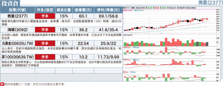 微星(2377)主要產品有主機板、多媒體專業顯示卡、伺服器、準系統、消費性電子產品、筆記型電腦,其中筆電以電競類為主。微星領先國內同業切入電競產品領域,高單價、高毛利,今年持續提升比重,並搭配虛擬實境(VR)熱潮,於春電展祭出多款適用VR頭戴顯示器的高效能筆電,搶攻VR商機。鴻碩(3092)為全球監視器連接線龍頭廠,近年跨入通路,開發車用連接線和蘋果手機車用充電線,從單季獲利來看,已從去年下半年起展現轉型成果,去年第三季到今年第一季EPS分別為○.六九元、○.五四元和○.四八元。由於四、五月份營收大幅拉高至二.四億元之上,且六月份維持相同水準,單季營收季增率約二二%,可望帶動第二季獲利持續飆高。元黃金(00635U.TW):受英國脫歐公投結果影響,避險商品獲投資人青睞。全球股市下挫,避險買盤推升紐約黃金期貨價格急漲,六月二十四日來到每盎司一三二二.四美元。法人表示,目前市場避險需求強勁,情緒未從英國脫歐震盪中平復,未來若風險事件持續干擾,原本就處於多頭格局的黃金,短線仍有表現機會。