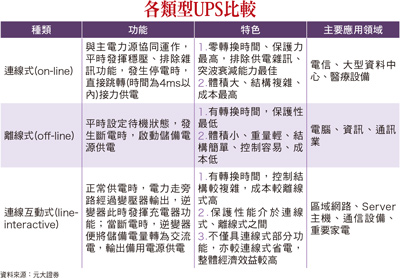 電力系統正常運轉守護神─ 不斷電系統(UPS)此時,堪稱是確保整套電力系統能夠較長時間正常運轉、穩定供電的守護神─不斷電系統(Uninterruptible Power Supply, UPS),可確保電力供應、機械裝置正常作動的重要安全網,於包含電信通訊系統、政府機關、醫療院所、金融機構、資料中心等重要場所,以及各製造業、交通號誌、教育及考試等UPS設備應用市場的需求也會跟著大幅升溫,相關零組件供應鏈台廠長線營運展望也有機會晴空萬里。不斷電系統依其結構設計原理,可略分為連線式(On-line)、離線式(Off-line)、連線互動式(Line-interactive)三類。一般而言,連線式UPS供電可靠度最高,不過由於價格高且體積龐大,多配置在重要電子設備如:電信設備、大型資料中心、醫療院所等場所。離線式UPS則由於輸送電源較不穩定,大部分使用在通訊及資訊業。連線互動式亦可歸類為離線式,不過較離線式UPS具備可靠的穩壓功能,也較連線式UPS具備價格低、體積小等特色,近年來已開始成為UPS電力系統市場的成長主力。全球UPS市場穩定成長 二○二五年將達一七九億美元隨著全球主要先進國家電力耗用,備用容量持續下降,限電警戒頻率不斷拉高,全球UPS產業近幾年來呈現穩定成長發展趨勢。根據著名機電產業調查公司Frost & Sullivan調查報告指出,全球UPS市場自二○一三年到二○一八年,預計將會以六.九一%的年複合成長率(CAGR)擴大,預估二○一八年底時將成長達一三五億美元。同時,根據台灣UPS大廠旭隼(6049)市調指出,預估二○二五年底全球UPS市場規模將大幅成長達一七九億美元。
