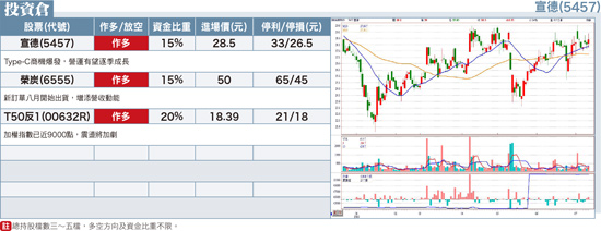 隨著電子廠商搭載意願提高,下半年起Type-C連接埠將進入大量商品化,供應鏈可將從過去的作夢題材邁向實質貢獻營收階段,有望迎來族群的主升段行情。下半年不僅有半數以上NB新品會搭載Type-C接口,高階智慧型手機也將開始採用,像是將上市的三星Galaxy Note 6,蘋果iPhone 7也將提供Type-C轉Lightning的連接線,加上Google Android全面原生支援,有助滲透率快速提高,商機爆發可期!目前已推出支援Type-C晶片方案的創惟(6104)、祥碩(5269)、鈺創(5351)及Type-C連接器表面處理匯鑽科(8431),近日股價均出現底部放量起漲訊號,顯示已有資金針對Type-C概念股進行卡位的動作,在下半年族群營運可望逐步升溫帶動下,股價將有觸底回升的機會。連接器廠宣德(5457)的中國母公司立訊精密,除了是蘋果lighting連接線主要供應商外,也開始為華為、OPPO、VIVO及樂視等手機品牌搭載Type-C的新品備貨,將是此商機下的最大受惠者。宣德預估今年Type-C連接器市場需求量達二億顆,宣德將可拿下中國近五成的市占率。受惠Type-C產品大量出貨,宣德營收自三月突破兩億元後就一路成長,上半年累計營收年增率已達二四%,成長率超過去年全年逾一倍,第二季預期在營收規模擴大下,有望由虧轉盈。股價歷經近一年的橫盤整理後,目前各天期均線已開始糾結,似乎已來到收斂末端,待未來股價放量突破,應可展開一波多頭攻擊行情。