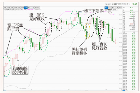 跌破短期上升趨勢線 黃金逢高也是賣接著再來看黃金市場,七月七日美國ADP就業人數公布增加一七.五萬人(前值一七.三萬人),且美國上周初請失業救濟金人數增加二五.四萬人(預期增加二六.七萬人,前值二六.八萬人),在七月八日非農就業資料公布之前,已公布的就業資料相對不錯,自然對於美元指數是正面激勵,於是美元強、黃金跌。儘管七日收盤遇到短期上升趨勢線一三五七美元支撐而收下影線,但是處在只能進、不能退的位階,果然八日公布美國六月非農就業報告的結果是對美元指數的利多,就在美元指數應聲大漲衝高到九六.七點的同時,黃金瞬間跌破短期上升趨勢線一三五七美元支撐,停損賣壓被觸發,造成盤中賣壓湧出,一度直接下殺到一三三六.五三美元低點,等於是打回原形到七月一日的長紅K支撐一三四一.九一美元。雖然八日最終收盤是拉了長下影線紅K,看似有利多頭,但在相對高檔區跌破上升趨勢線後的由黑翻紅,怕是騙線居多,因此基於當沖八法的「若遇騙線,反手停損」原則,七月十一日起黃金最好也是逢高找賣點。檢視美原油的日K線圖,就可以體會到當沖八法第八招─「連二實K,見好就收」的妙用之處(如附圖),在一個跌深反彈或拉回修正的格局,連二實K是常見的K線走勢,此時若總是期待「紅三兵」或「黑三兵」,就經常會錯失平倉出場的機會。因此當出現連二實K之後,態度上應該謹慎的觀察後續走勢是否守穩支撐或壓力,當多頭跌破支撐時,就不可再一廂情願的等待紅三兵的到來,反之亦然。連二實K 見好就收 短線漲跌幅過大 可能乖離回檔就算真的守住支撐或壓力走出紅三兵或黑三兵,也不要太高興,因為短線的漲跌幅過大,經常有乖離的回檔,所以當沖八法第八招的下半式─「漲三不進,跌三買」,就是在提醒操盤人,紅三兵與黑三兵雖然確認波段的趨勢,但是短線累積漲跌幅恐過大,因此要留意短線的乖離修正可能性發生。當沖八法的招式已逐一介紹,接下來就是綜合應用當沖操作技巧與心法,光有招式而不知如何應用,仍難晉升贏家行列。例如,短線上漲走勢遇到走平或下彎的均線時,要記得賣出,尤其當這條走平或下彎的均線是20MA時,更是要戒慎恐懼,因為那代表趨勢的轉折。更多的當沖八法的操作實務細節,歡迎報名七月二十五、二十六日的收費課程,相信一定能夠讓投資人收穫滿滿。